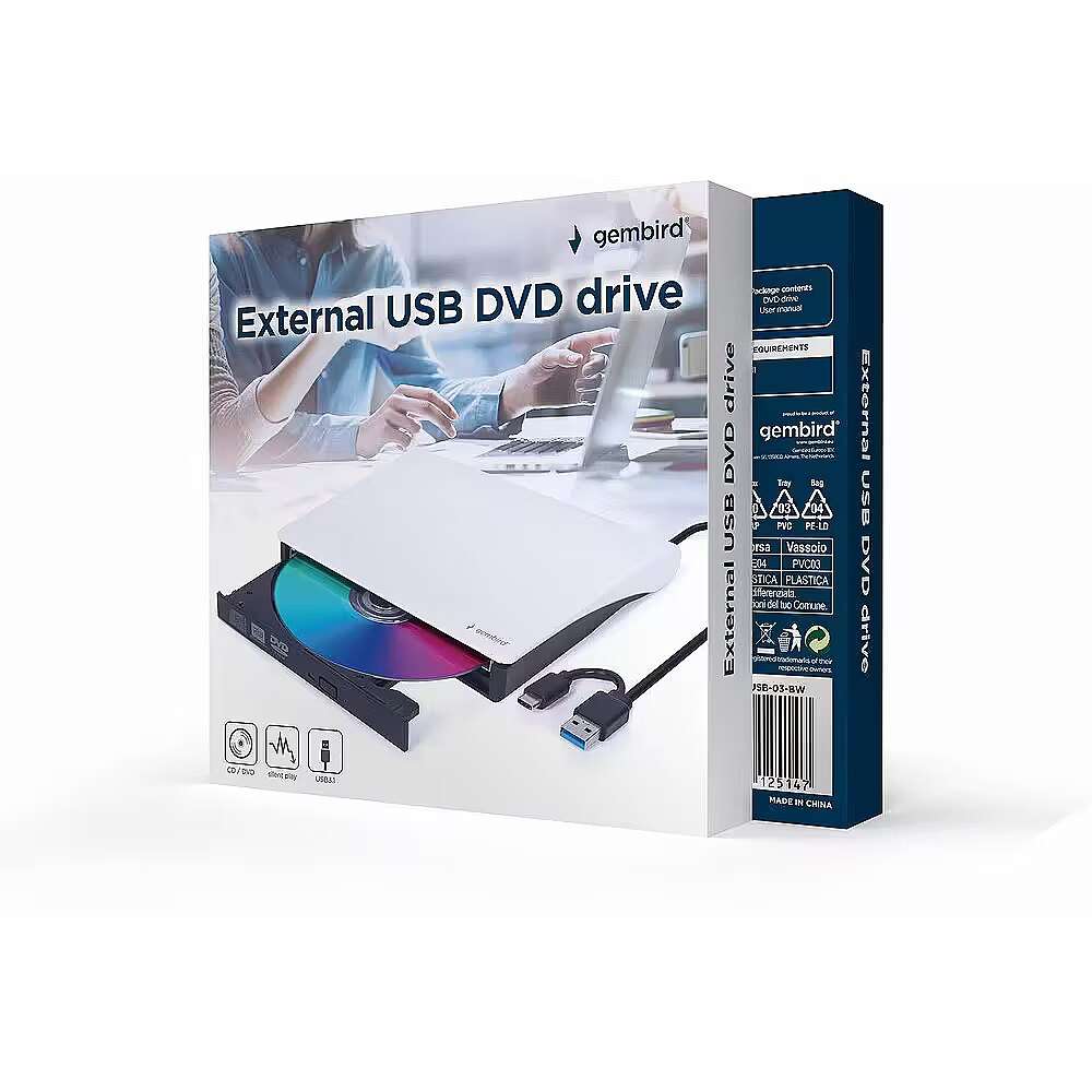 Description - External USB DVD drive DVD-USB-031-BW black and white External CD/DVD reader/writer with USB interface It allows you to quickly burn CD/DVD media with a writing speed of 24x for CD and 8x for DVD High-speed USB 3.1 interface for reliable use and fast data transfer Quiet playback, intelligent disc read speed control reduces operating noise Archive your videos, photos, data and music to CD or DVD Compact design, ideal for use with laptops Quiet operation The optical drive contains renewable components