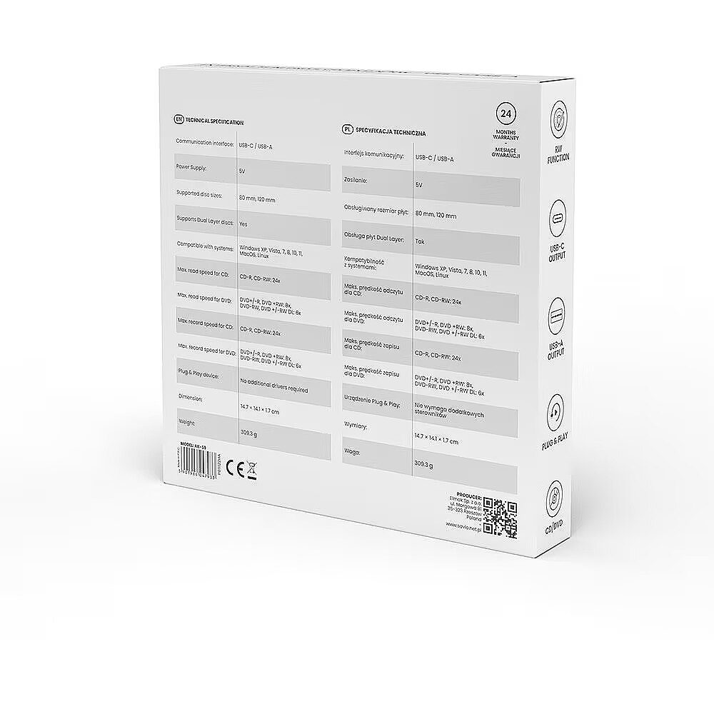 Description -   Technical specification: Communication interace: USB-C/USB-A  Power Supply: 5V  Supported disc sizes: 80 mm, 120 mm  Supports Dual Layer discs: yes  Dimension: 14.7 à 14.1 à 1.7 cm  Weight: 309.3 g  Compatible with systems: Windows, XP, Vista, 7, 8, 10, 11, MacOS, Linux  Plug & Play device: No additional drivers required  Max. read speed for CD: CD-R, CD-RW: 24x Max. record speed for DVD: DVD+/-R, DVD +RW: 8x, DVD-RW, DVD +/-RW DL: 6x Max. record speed for CD: CD-R, CD-RW: 24x Max. record speed for DVD: DVD+/-R, DVD +RW: 8x, DVD-RW, DVD +/-RW DL: 6x