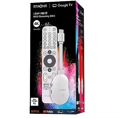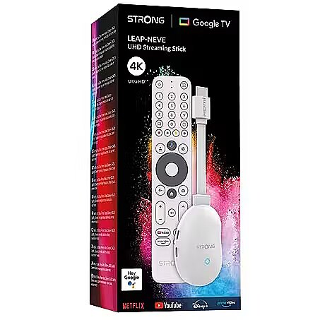 Description - Meet LEAP-NEVE, a sleek and innovative streaming stick designed to transform any screen into a powerful Smart TV. With Google TV, you get access to over 400,000 movies and shows across 10,000+ apps, all organized just for you. Watch your favorite content on Netflix, YouTube, Prime Video, Disney+, DAZN, Spotify, and more - all in one place. With Google Cast, you can easily stream content from your smartphone, tablet, or laptop directly to your TV. The LEAP-NEVE includes powerful features such as 4K UHD resolution, H.265 decoding, dual-band Wi-Fi 6, Dolby Vision & Dolby Atmos, an integrated Ethernet port, and more. Thanks to the fully integrated Google Assistant, you can control playback, play or resume TV shows and movies with voice commands, and even get answers to your questions. Compact, stylish, and easy to use, LEAP-NEVE is your gateway to unlimited entertainment. Certified Google TV streaming stick (Android 12, upgradeable to Android 14) 4K Ultra HD video decoding (3840 × 2160) Supports HDR10, HDR10+, HLG, Dolby Vision Dolby Atmos immersive audio Fast streaming with Wi-Fi 6 (up to 1.8 Gb/s) 8 GB storage Access to 10,000+ apps and streaming services via Google Play Store Bluetooth 5.0 for easy connection with speakers, headphones, or keyboards Full-size 2-in-1 remote control with voice control