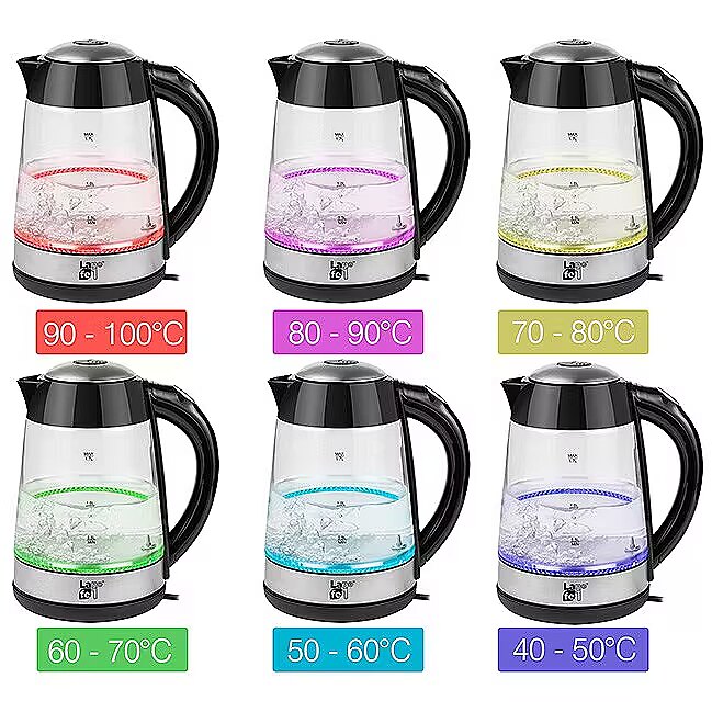 Description - Lafe CEG015 glass kettle essential for your kitchen An electric kettle is an essential piece of equipment for any modern kitchen. The Lafe appliance boils water quickly thanks to its high power, so it is perfect for any home. Modern design, transparent water jug and backlighting distinguish the Lafe kettle, from others available on the market. High power 2200 W. Jug made of durable glass. Micro mesh filter. 360 degree swivel base. Illuminated on/off switch. Clear water level indicator. Protection against overheating and against starting without water. Colour illumination of the kettle. Temperature control from 40-100 degrees C. 2200 W power. Large capacity of 1.7 L. Plate heater. Temperature regulation The kettle is equipped with an adjustable thermostat, allowing you to choose from 7 levels of water heating :40,50, 60, 70, 80, 90 or 100 degrees. The illuminated interior of the kettle informs you when the heater is on or when the kettle is off, and the colour of the illumination changes according to the set mode of operation. Limescale-free clean water The kettle is equipped with a special microfilter which captures any limescale particles and deposits from the boiling water. The filter can be easily removed and quickly cleaned under running water. Enjoy always clean water and clear, sediment-free tea. Capacity for the whole family With the kettle's large capacity of 1.7 litres, you can boil approx. 6-7 cups of water at the same time. For family meals or gatherings with friends, you no longer have to wait to serve coffee or tea, you can quickly boil water for everyone in one cycle! The illuminated switch makes everyday use of the Lafe kettle even more convenient. 360° rotatable base The 360° swivel base used on the Lafe kettle is very practical and ensures that the kettle always stands stable. Safety and freedom of use is ensured by the power cord located in the charging base separate from the kettle.