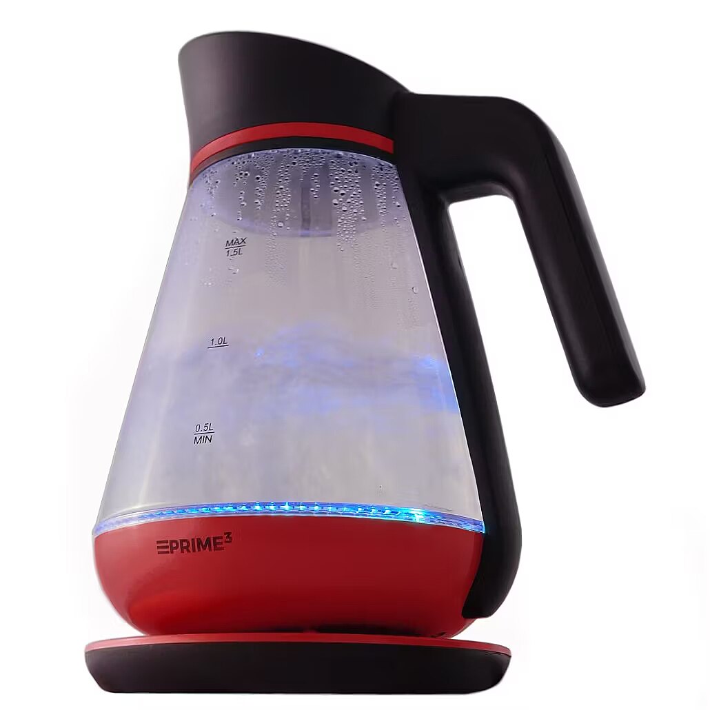Description - EXCEPTIONAL FUNCTIONALITY SEK51RD kettle by PRIME3 with 2200-Watts power and 1,5l capacity (min 0,5l) will meet the expectations of most demanding users who care not only about the aspects of functionality but also value the design. Owing to ergonomic handle, rotary base and heating element hidden in a flat stainless steel bottom, the device is tremendously convenient in everyday use. The forgetful will never have to worry again- the kettle has an automatic shut-off mechanism and it will switch itself off after the water is fully boiling. In addition, a boil dry protection feature guarantees more safety. SEK51RD is also equipped in anti-drip spout, thanks to which the water will neither drip nor spill, another interesting features concern a water level indicator which helps to control the amount of water and separable base with a storage for excess cable. LESS LIMESCALE The SEK51RD model was made of borosilicate glass, thanks to which it has increased thermal and mechanical resistance. This material is also less susceptible to deposits, which will be appreciated by users who deal with hard water on a every-day basis. An additional, built-in lime scale filter will make sure that the sediment does not get into our cup. Undoubtfuly, this feature is something that every housewife will appreciate. CONTEMPORARY DESIGN Blue LED light visible immediately after switching on the kettle, illuminates the boiling water, which looks staggeringly impressive, especially in a dark room. Elegant glass body with red and black decorative elements will surely appeal to all those who care about modern interior design.