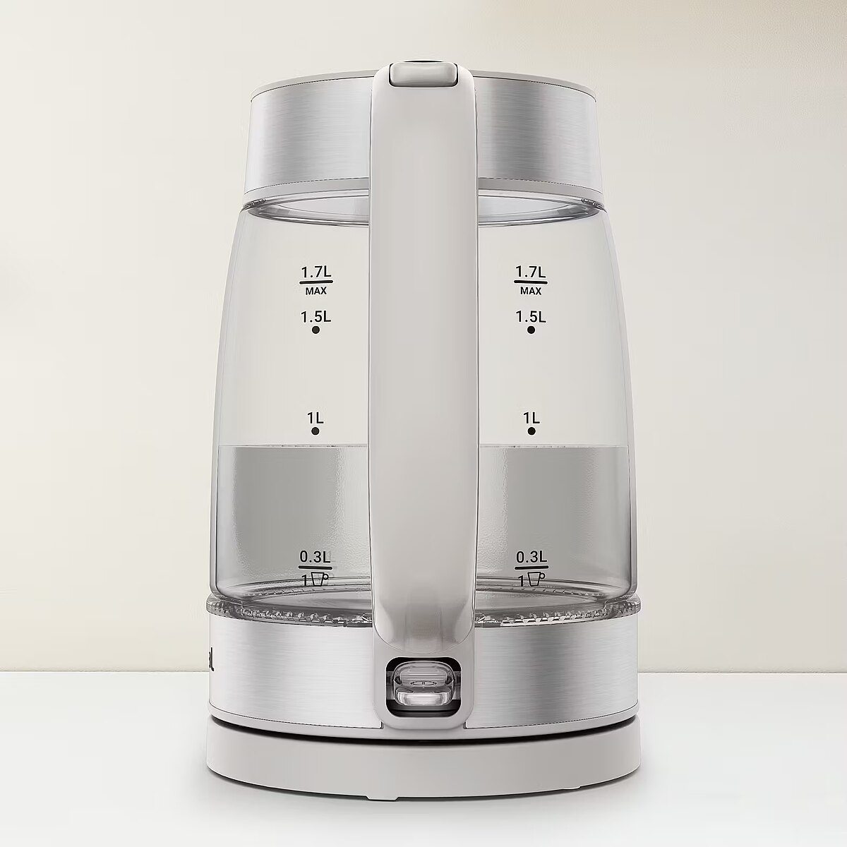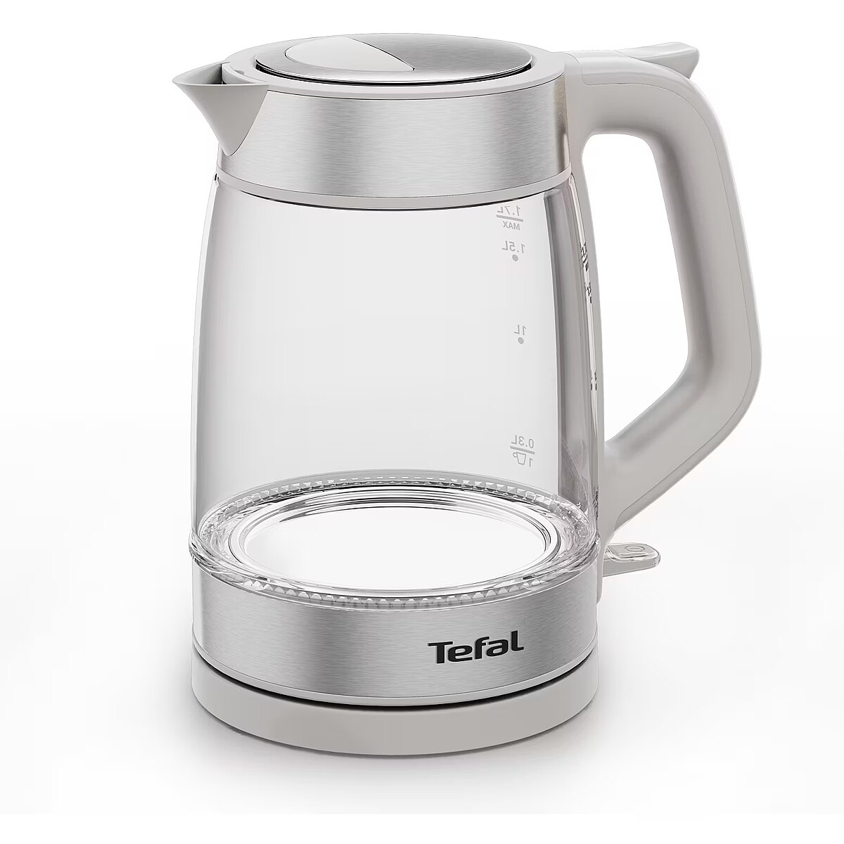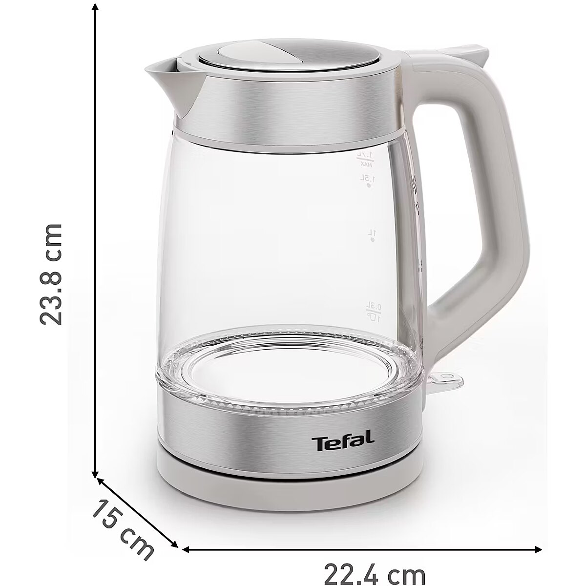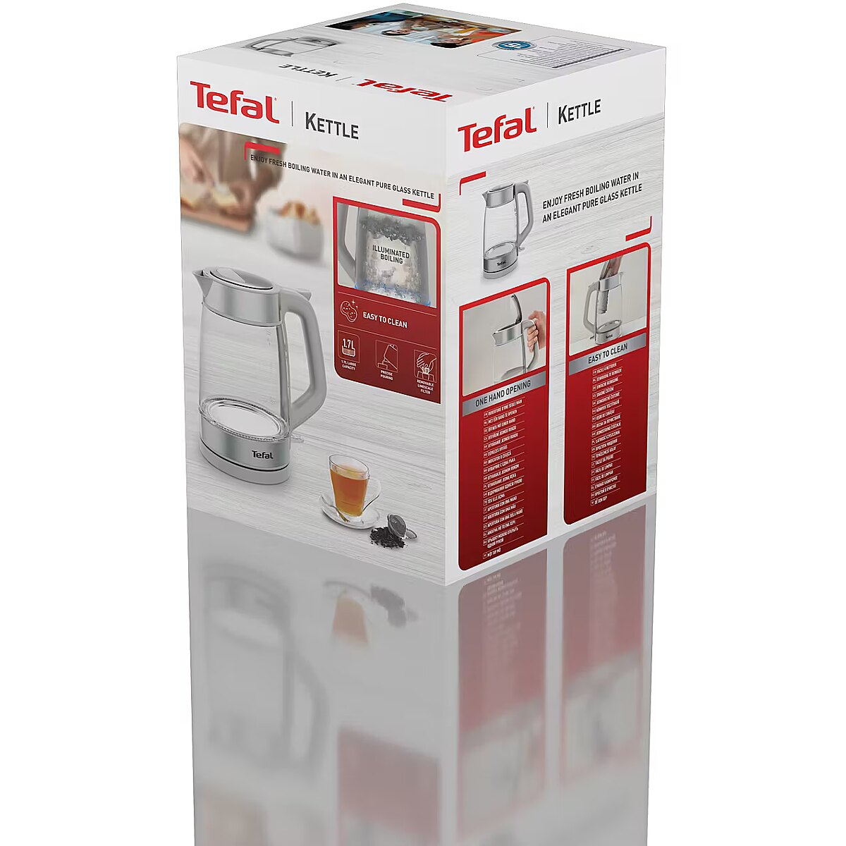 MediumDescription EN - Finally, an electric kettle that's as elegant as it is convenient! The Glass Kettle by Tefal features a transparent body with measurement marks for precision filling, as well as a generous capacity ideal for use with family and friends. Easy to clean, it's also equipped with a precision spout to ensure drip-free pouring, a removable anti-scale filter for cleaner water, and an easy-open lid. Plus, stunning ambient lighting indicates that the kettle is working—for an added aesthetic touch! • Wide opening and concealed heating element make cleaning easy