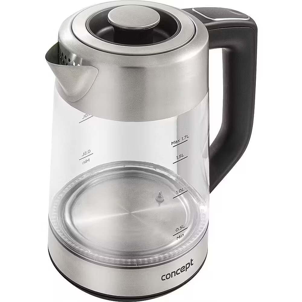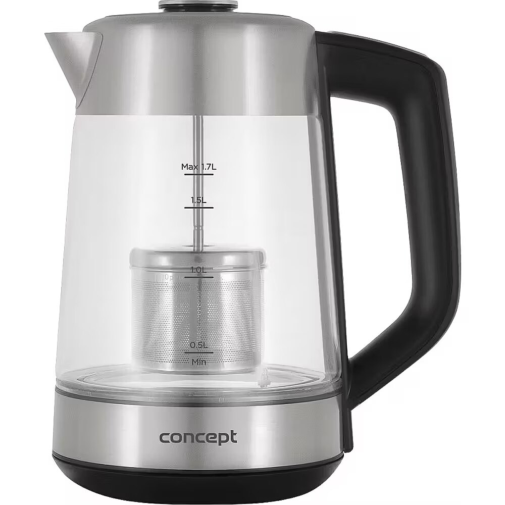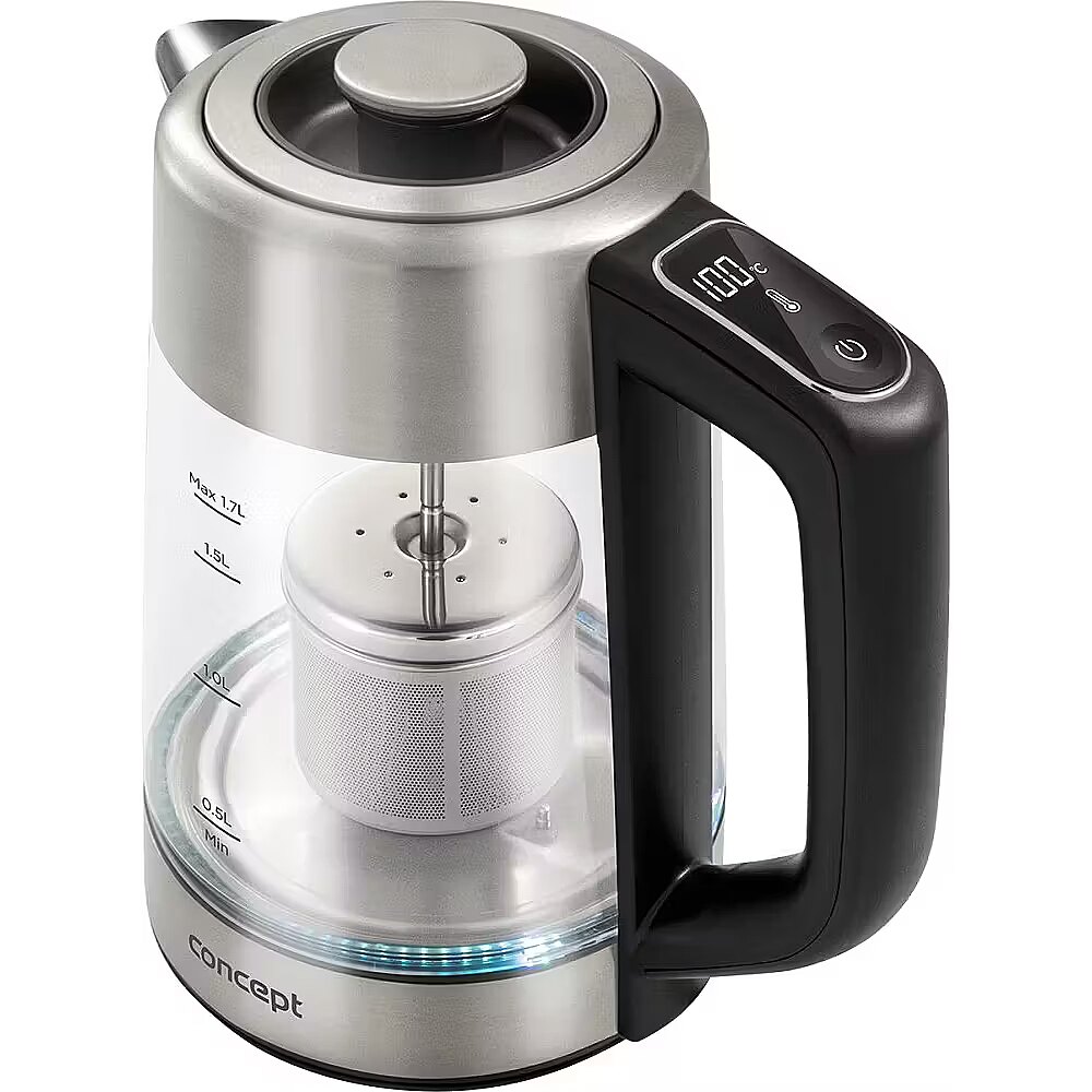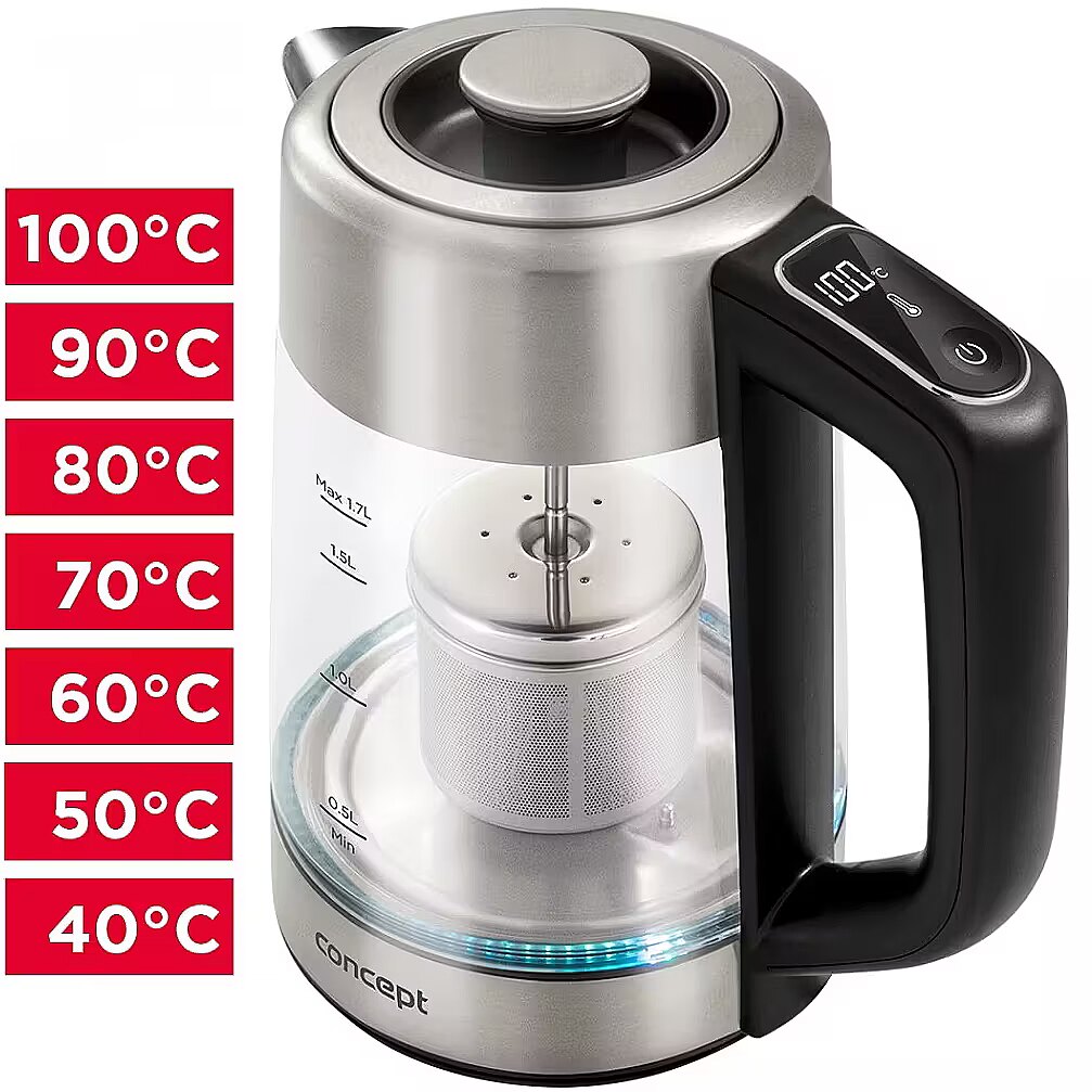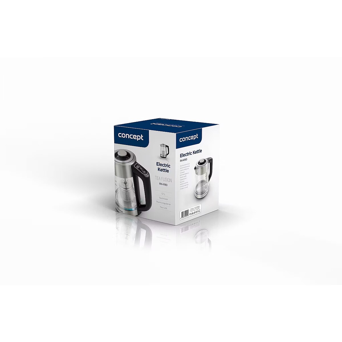 Description - RK4190 glass kettle A special lid with a strainer makes it easier to prepare your favorite tea The great advantage of the Concept RK4190 kettle is that, in addition to the classic lid, it is equipped with a second special lid with a strainer. This will especially please all tea lovers, as it will make its preparation easier. You can brew the tea leaves directly in the kettle and, after the required time, simply pull the strainer above the water surface. Combined with temperature control, you can prepare any type of tea. Thanks to the precise temperature and brewing time, the tea acquires a distinct flavor and you can enjoy it to the fullest. 7 levels of temperature regulation with colorful backlight The kettle is equipped with digital control with the ability to adjust the temperature from 40°C to the boiling point. This will certainly be appreciated not only by tea and coffee lovers, but also by parents of small children when preparing meals for babies. The glass structure of the kettle has colorful backlighting depending on the current water temperature. There is also a practical Keep Warm function that keeps the heated water at the desired temperature. Modern design and quality of workmanship The kettle is made of very strong, health-friendly and heat-resistant glass. It has a stainless steel neck reinforcement that protects the kettle against damage. The minimalist base on which the kettle stands has a compartment for storing the cable, so you can adjust its length to your needs. STRIX is a guarantee of high quality.