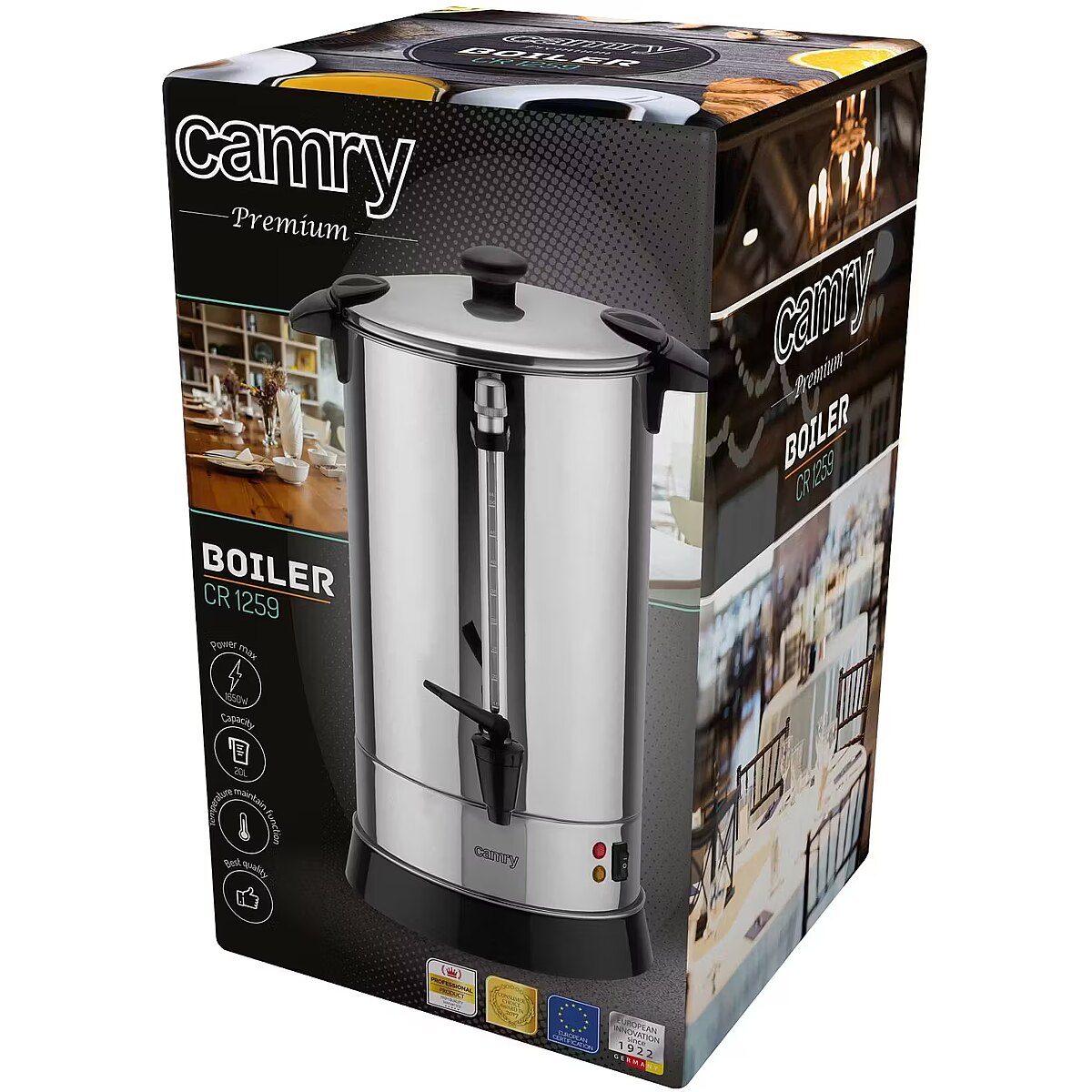 Wykonany ze stali nierdzewnej warnik CR 1259 pozwala zarówno na podgrzewanie wody, jak i utrzymywanie jej temperatury. Niezastąpiony w czasie konferencji do organizacji przerw kawowych, a także przy różnego rodzaju spotkaniach biznesowych, naukowych i towarzyskich. Dzięki swojej mobilności doskonale sprawdza się jako wyposażenie firm przygotowujących eventy. Warnik Camry jest prosty i wygodny w obsłudze, a dodatkowo zapewnia bezpieczeństwo użytkowania (nienagrzewające się uchwyty i kranik).
