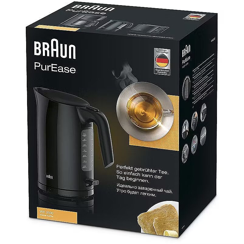 ShortSummaryDescription - Braun PurEase WK 3100 BK, 1.7 L, 2200 W, Black, Water level indicator, Overheat protection, Cordless