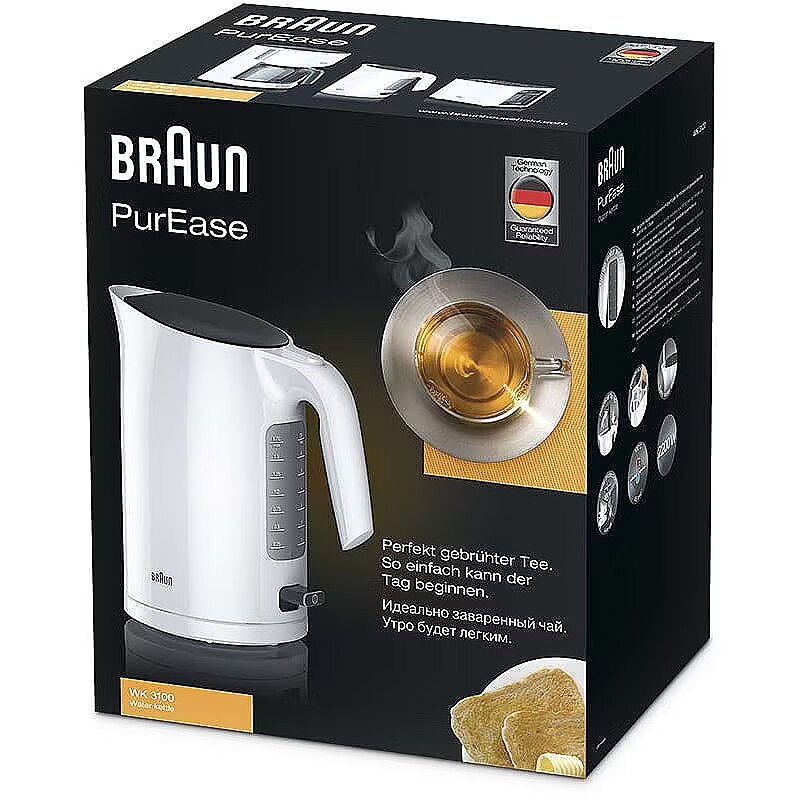 ShortSummaryDescription - Braun PurEase WK 3100 WH, 1.7 L, 2200 W, White, Water level indicator, Overheat protection, Cordless