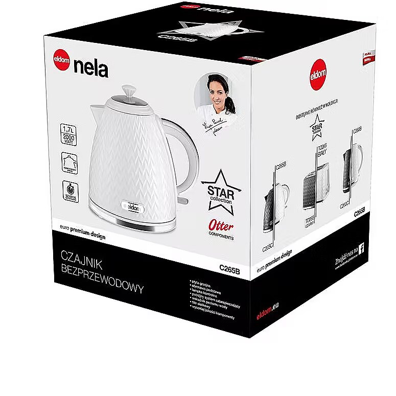Description - The C265B NELA cordless kettle from the "STAR COLLECTION" series with a power of 2000W is an effective design and reliable operation. It was made of high-quality OTTER components and will boil 0.5 to 1.7 L of water in no time. It has a comfortable handle, a swivel base with space for winding up excess cord, a water level indicator and a mesh filter that stops limescale particles. You can fill it directly through the spout or after opening the lid. It also has a triple safety system, and when it is working, the indicator lamp (located in the switch) lights up. After boiling water, it turns off automatically, but you can also turn it off at any time using the switch. The C265B NELA model looks great. It has an original shape, an interesting texture on the casing, and special attention is paid to the silver trim, which gives it a real glow.