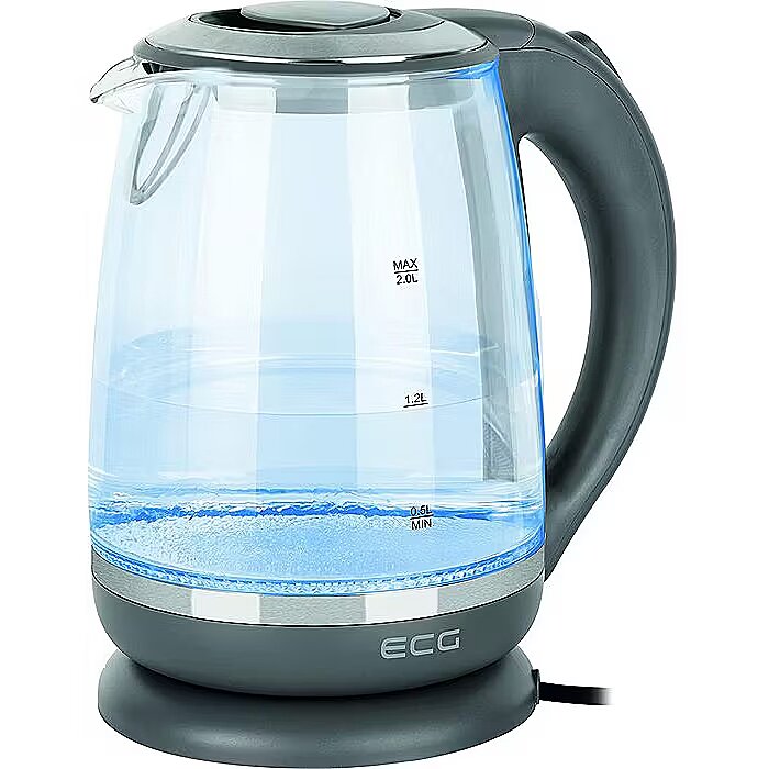 ProdDesc - ECG Electric kettle RK 2020 Grey Glass, 2 L, 360° base with power cord storage, Blue backlight, 1850-2200 W