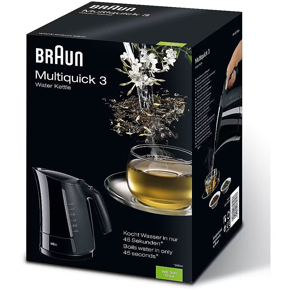 LongDesc - Braun water kettles combine a unique Braun design with a rapid boiling system for ultimate performance. With the Braun water kettle boiling water is fast, easy and safe. It‘s German Technology guarantees that you can expect excellent performance day after day.Rapid boil systemThe Rapid boil system boils water in 35-45 seconds**35 seconds for WK 500 -200 mL*45 seconds for WK 300 -200 mLUnique 4-way safety systemThis system provides extra safety for use in your home. The kettle switches off automatically when kettle is empty, water is boiled, the lid is opened or the water kettle is removed from its base.Anti scale filterThe anti scale filter is removable and washable.Easy filling systemThe Multiquick water kettle can be filled directly from the tap through its large spout. It has a capacity of 1.6 liters.Convenient handlingThe on/off switch and button for opening the lid are in easy reach. The Multiquick water kettle is also designed for both right and left handers. It has two symmetrical water level indicators and the jug can be placed on the 360° from every side.German technology - Guaranteed reliability