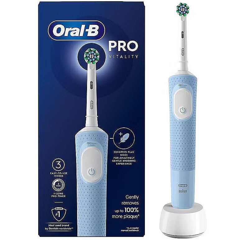 MediumDescription EN - • The Oral-B Vitality Pro electric rechargeable toothbrush provides a clinically proven superior clean vs. a regular manual toothbrush. • 3 brushing modes: daily clean, sensitive and sensitive plus mode for an amazingly gentle experience. • An in-handle timer helps you brush for a dentists-recommended 2 minutes. • The essential toothbrush to achieve a better & gentler clean