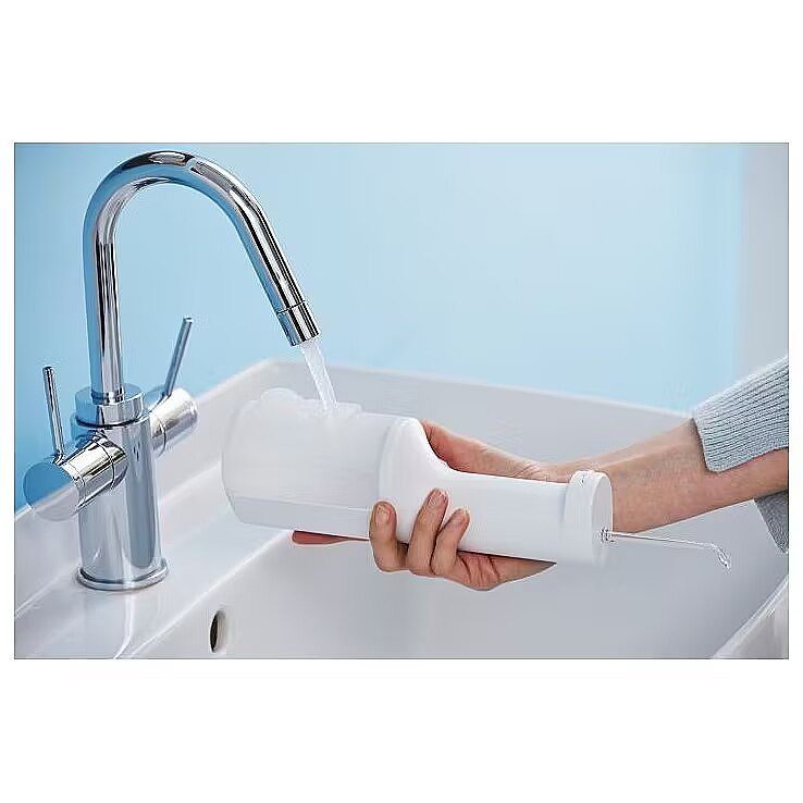• Flushes out food debris from hard-to-brush areas like between teeth, braces, or bridges