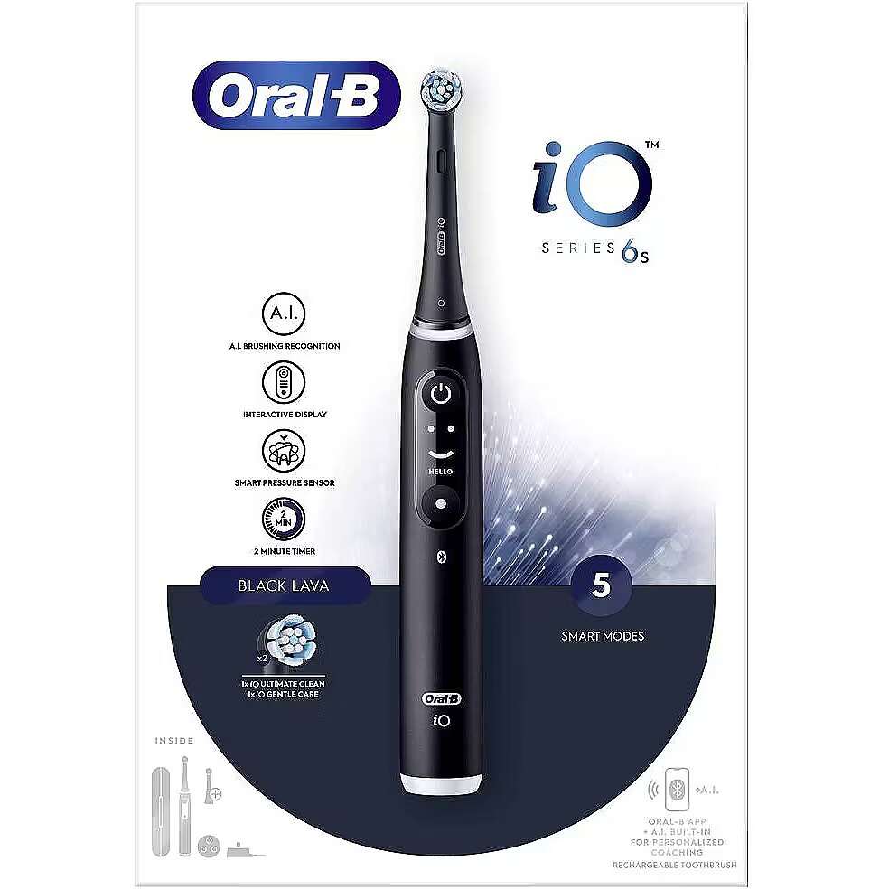 LongSummaryDescription - Oral-B iO 6. Purpose: Adult, Toothbrush type: Vibrating toothbrush, Teeth brushing modes: Daily care, Deep clean, Gum care, Sensitive, Whitening. Power source: Battery, Battery type: Built-in battery. Package type: Box. Number of handles included: 1 pc(s), Number of brush heads included: 2 pc(s)
