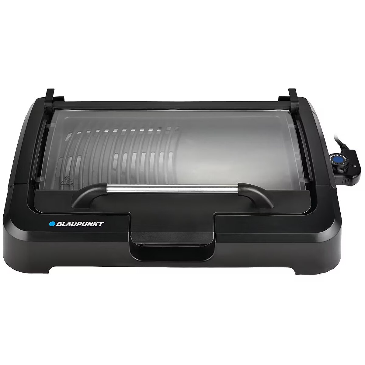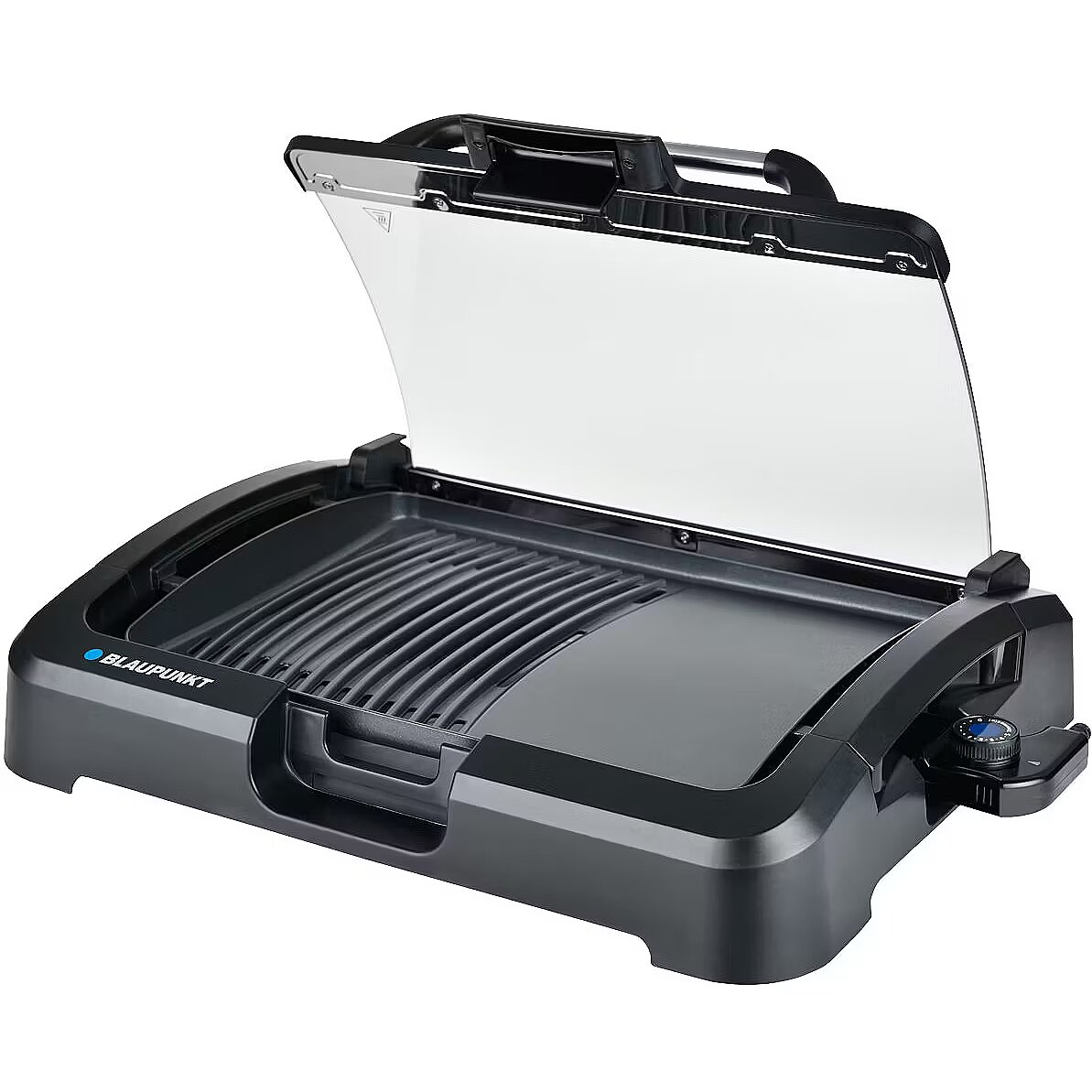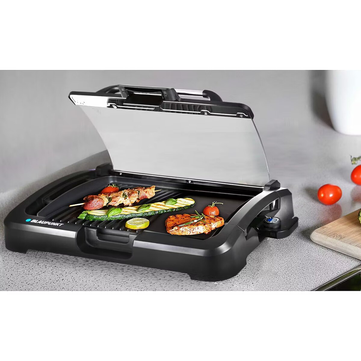 Description - GRT801 electric grill The power of the GRT801 is 2200 W, thanks to which the grill heats up very quickly, ensuring high operating efficiency. The glass cover helps maintain and control the high temperature, which also prevents grease from splashing on the furniture. The removable heating plate with dimensions of 39 x 29 cm is covered with a non-stick coating without PFOA, which guarantees that our dishes will be safe for health and will not burn or stick during grilling, which often causes them to fall apart. Dishes prepared on the grill are very aromatic, tasty, and often low-calorie. In the spring and summer season, you can smell grilled meat, vegetables and fish from every garden, which proves how many fans they have. However, if we do not have a garden or plot of land, an alternative to a charcoal or gas grill may be a compact and easy-to-use table-top electric grill. The Blaupunkt brand, to meet the needs of grilling enthusiasts, has created the GRT801 model, which makes preparing food easy and pleasant. The corrugated and flat surface of the plates allows you to toast different types of products at the same time. The flat one is perfect for roasting vegetables, and the corrugated one is perfect for grilling meat. The corrugated part also allows excess fat to be removed, which allows us to enjoy more easily digestible dishes. Temperature regulation with a knob, stay-cool handles and an indicator light indicating the operating time of the device make it more comfortable to use. The argument in favor of a table-top electric grill is certainly that it takes up little space and can be used at any time of the year at home, on the balcony or terrace.