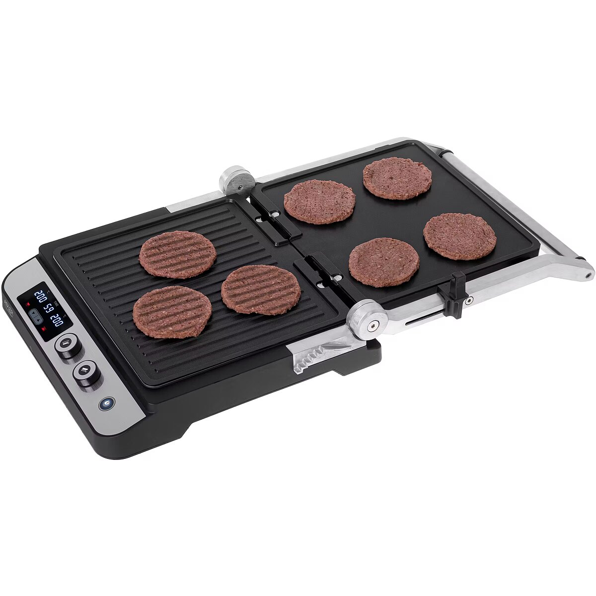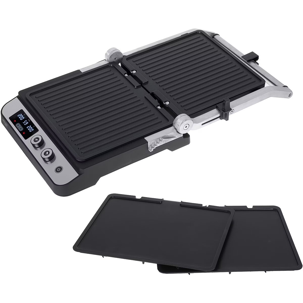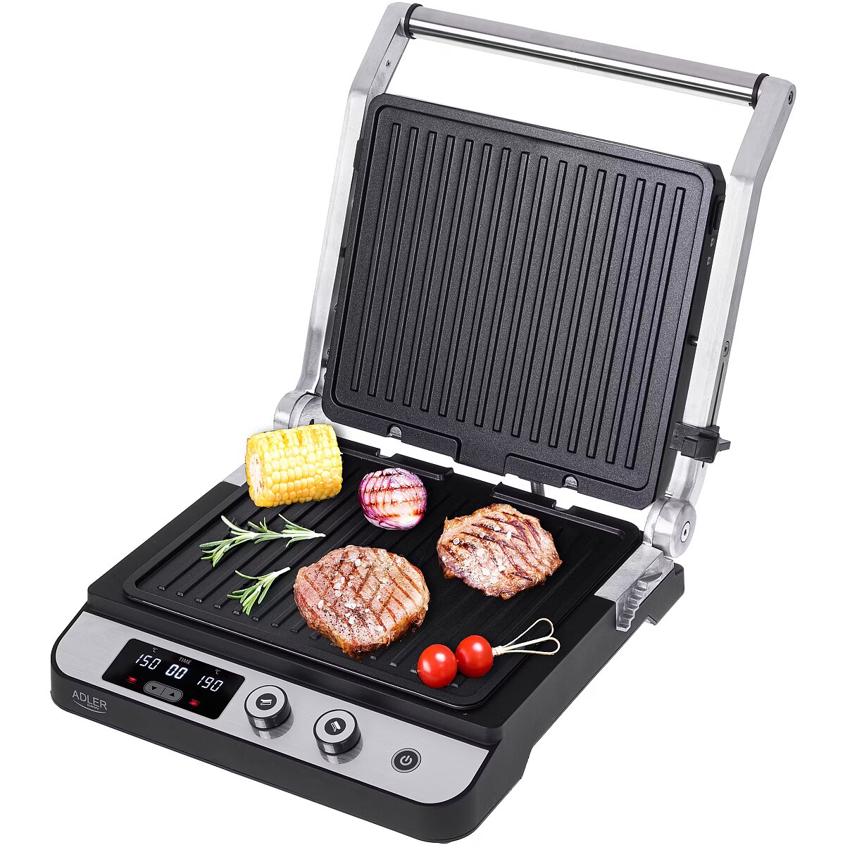 description_lv - Adler 3059 elektriskais grils ar LED displeju ar maksimālo jaudu 3000W ļauj pagatavot plašu karsto ēdienu klāstu – no grauzdētiem burgeriem, līdz steikiem, cūkgaļas kaklam, vistas gaļai un citai gaļai, līdz grilētiem dārzeņiem un sieriem. Sildīšanas plāksnes ir aizsargātas ar teflona pārklājumu, pateicoties kuram ēdiens nelīp, un turpmākā mazgāšana aizņem tikai mirkli. Turklāt pārklājums ļauj grilēt, nepievienojot taukus, un tauku drenāžas caurums padara traukus veselīgākus. Ierīcei ir ērts vadības panelis ar LED displeju.