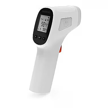 LongDesc - The Motorola TE-93 Touchless Forehead Thermometer is quick and easy to use, providing an accurate, ultra hygenic and non-intrusive temperature measurement every time.No-touch infrared technologyFor safe and hygienic non-intrusive measurements.High temperature alertAudible alert when temperatures are > 37.5 °C (99.5 °F).Fahrenheit or CelsiusSwitch how the temperature is recorded.Simple to usePoint the thermometer at the forehead and press button.Quick readingsFast two second reading. Beeps when done.Memory functionStores the 32 most recent readings for easy recall.Bright backlit displayMakes temperatures easy to read, even in the dark.