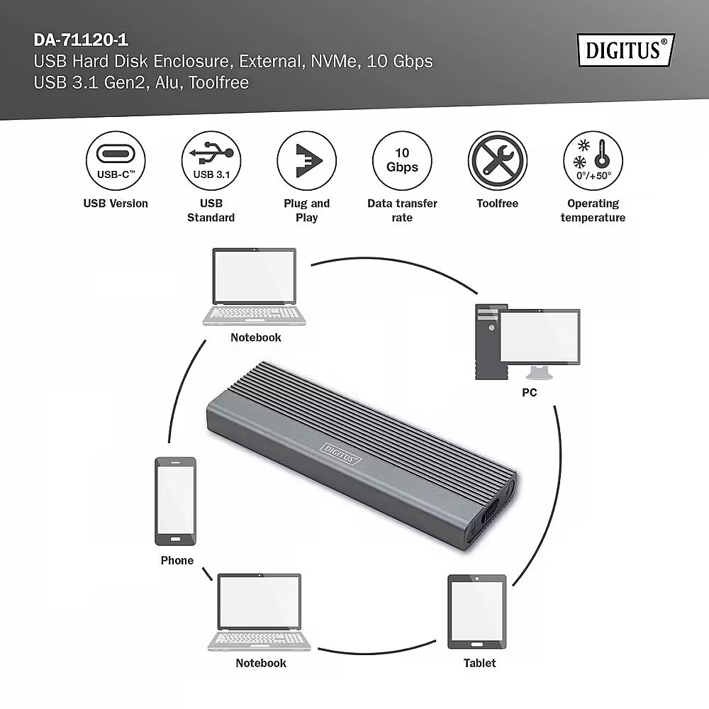 Name - Digitus USB M.2 hard disk enclosure, SSD, external, NVMe, 10Gbps, USB 3.1 Gen2 | DA-71120-1