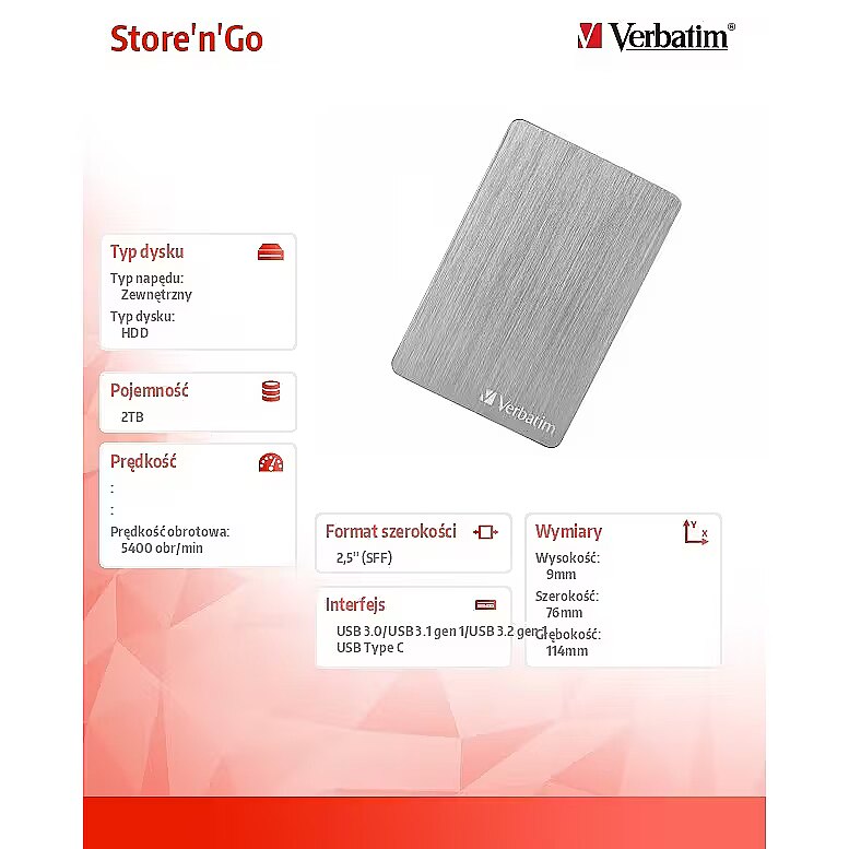 Description - The Verbatim Store n Go ALU 2TB is a stylish and functional portable hard drive designed for convenient data storage and transfer. Its brushed aluminum casing boasts a modern look and robust build quality, while its compact size makes it easy to carry to work, home, or on the go. Its slim design, measuring 9mm thick and weighing just 150g, ensures comfortable everyday use.