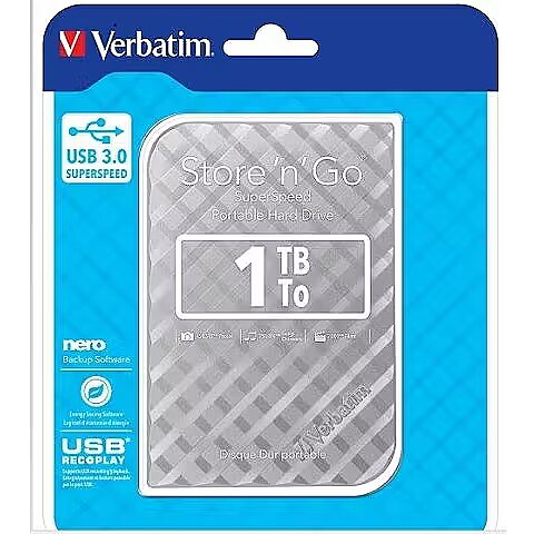 LongDesc - - Colours available: Black, Silver, White, Red & Blue- High speed, high capacity storage. A fast & safe solution to expand storage or backup files- USB 3.0 SuperSpeed - for ultra fast data transfer- USB plug 'n' play (no additional power required)- Nero Backup Software- Energy Saving Software - USB REC & PLAY - supports USB recording/ playbackThe Verbatim Store n Go portable hard drive features high performance storage using a USB 3.0 “Super Speed” interface. USB 3.0 offers up to 10 times faster data transfer rates than USB 2.0 (based on USB bus speed) providing ultra fast data transfer on the go.Store and carry your digital and day to day working files on this truly mobile drive. Its stylish design sits neatly on the modern desk top as the perfect accompaniment to your laptop.Store n Go portable hard drive is USB 3.0 bus powered (1 x USB 3.0 interface) yet is backwards compatible to any USB 2.0 ports on your PC or notebook. The drive requires no external power for operation; simply plug n play.Drives that are 2TB or under are formatted in FAT32 allowing them to operate immediately on Windows and Mac OSx. Drives above 2TB are formatted in NTFS which is compatible for Windows systems but require Mac users to reformat the drive to HFS+ to make them fully compatible with Mac OSx operating systems. HFS+ formatting can be applied by using the Verbatim VHD Formatter which is on the drive.For added security Nero Backup software is provided to help back up your laptop or PC's hard drive. Backup provides an application to back up all your files, folders, and drives whenever you want, or schedule the auto back up to a set time for added security.Nero Backup Software is compatible with Windows XP, Vista, Windows 7, Windows 8 and Windows 10 (not compatible with Mac OS).Verbatim Store 'n' Go Portable Hard Drives also come with Green Button energy saving software. Green Button software suspends the hard drive from spinning while not in use increasing efficiency and saving energy.There are 3 'Sleep Setting' options. Set the suspend mode to come in after 10 minutes of use, or by increments of 10 minutes up to 120 minutes. Set the drive to suspend immediately by double clicking the Green Button icon on the desktop, alternatively you can set the drive to 'Never Suspend the disk'This range of Hard Drives is available in 5 colours: Black, Silver, Blue, Red and White.