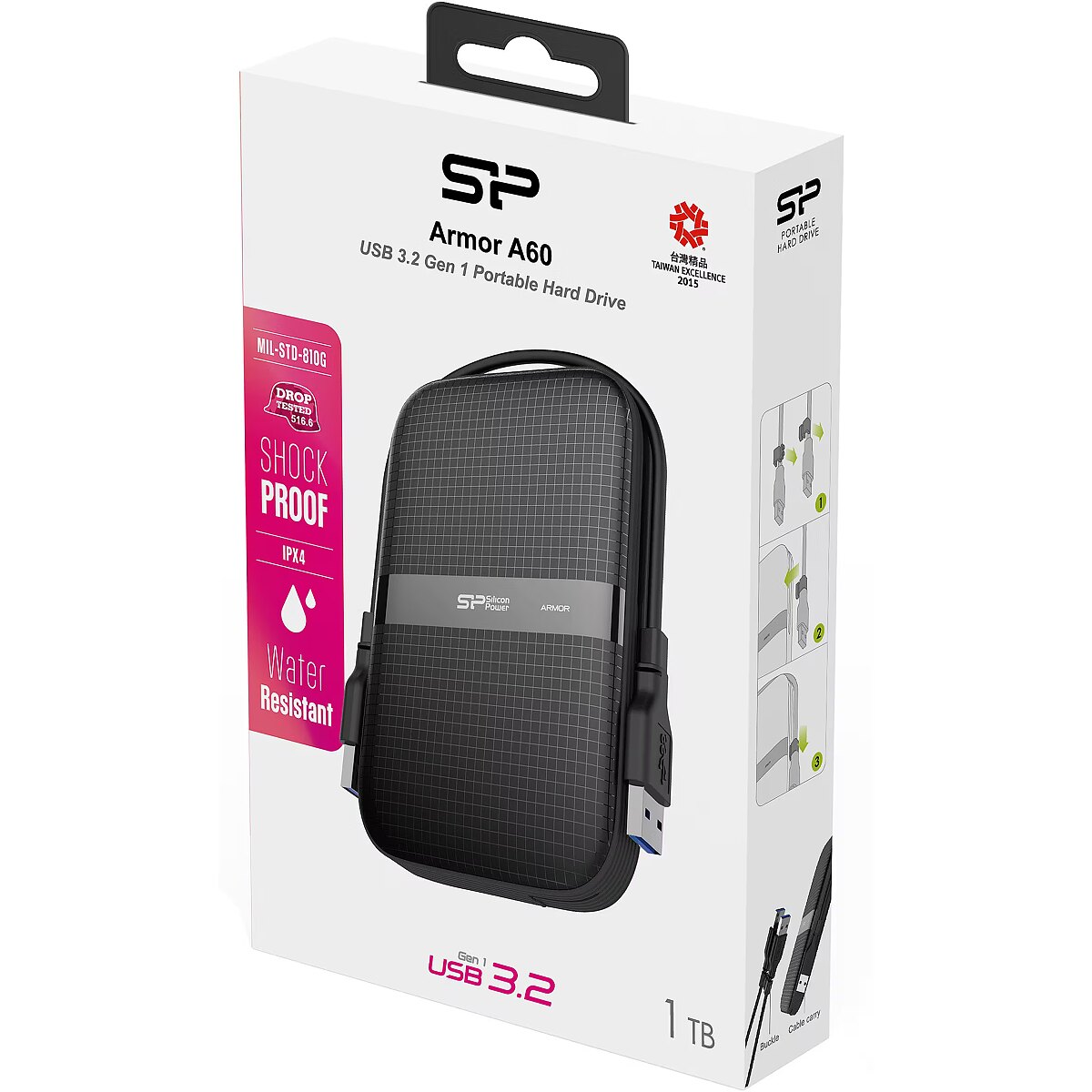 description_en - Shockproof & Water-resistant Armor A60 incorporates ultra-rugged rubber casing and internal suspension system, which enable perfect buffer effect and assure rigid protections against crushes, dust and spraying water. Furthermore, it passed the US military MIL-STD-810G (transit drop test) and IPX4 waterproof level, offering perfect data protection for outdoor users. SuperSpeed USB 3.2 interface Armor A60 introduces the SuperSpeed USB 3.2 interface that ensures ultimate ultra-fast data transfer speeds and offers users an extremely effortless and time-saving user experience. Cable-carry design The innovative slot design is especially equipped for simple cable carrying and storing by which users can easily wrap the cables around the drive. Anti-slip, Anti-scratch Armor A60 exercises the special surface texture that can not only allow anti-slip function but also keep the drive from damages caused by fingerprints and scratches. Pass the U.S. military drop-test standards MIL-STD 810G Method 516.6 Procedure IV (transit drop test), including specific height free fall test (122 cm). Mark the IPX4 water-resistant level SuperSpeed USB 3.2 compliant and backwards compatible with USB 2.0 Cable carry design Advanced internal hard drive suspension system Easy to plug and use;no external adapter required SP Widget free download software, providing 7 major back-up and security functions