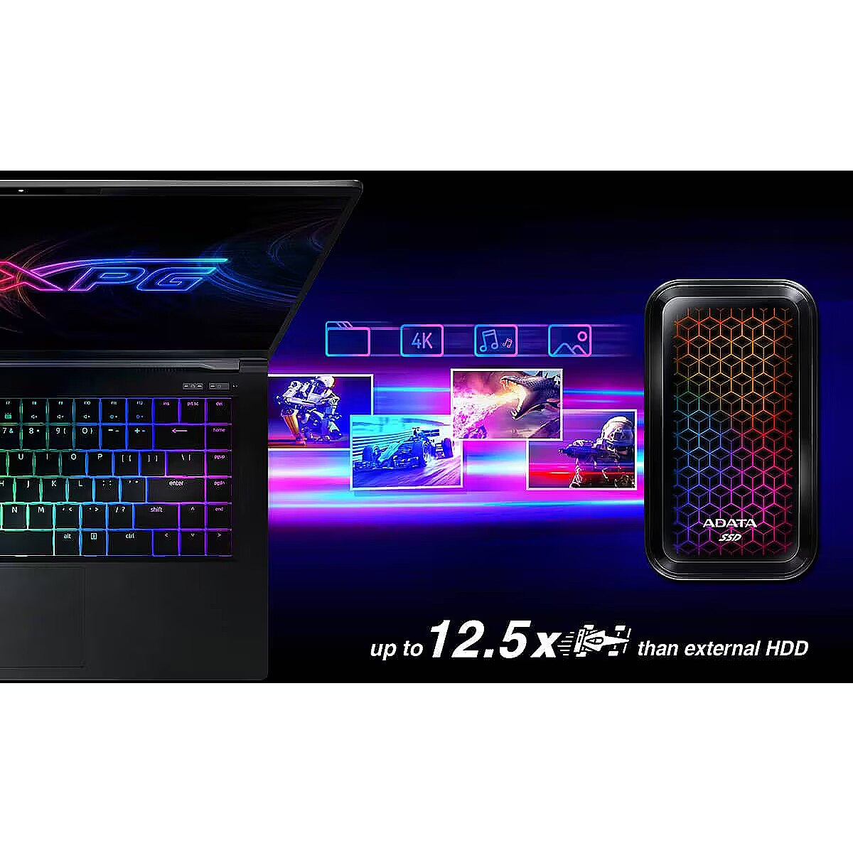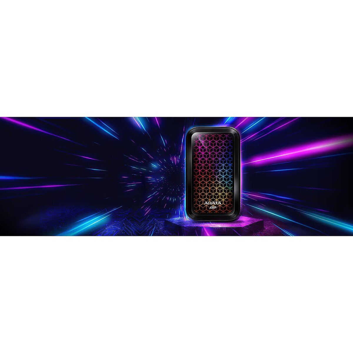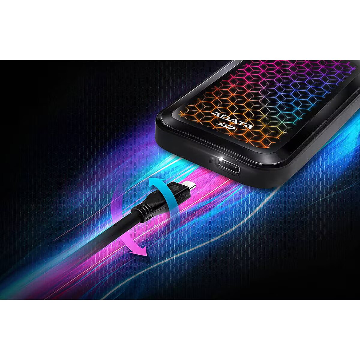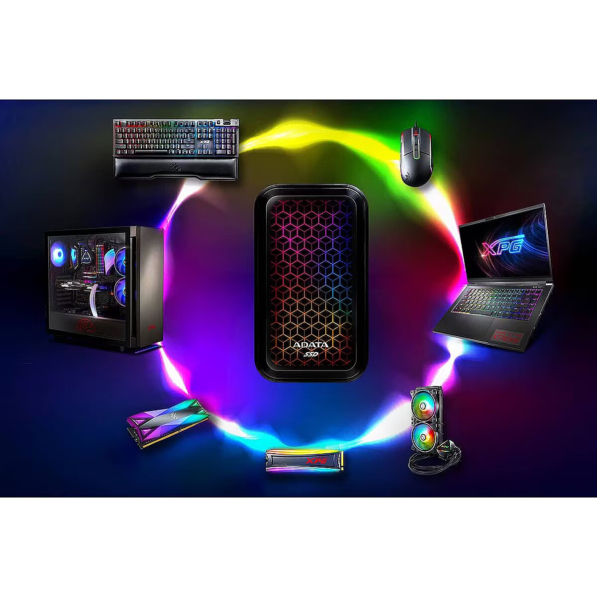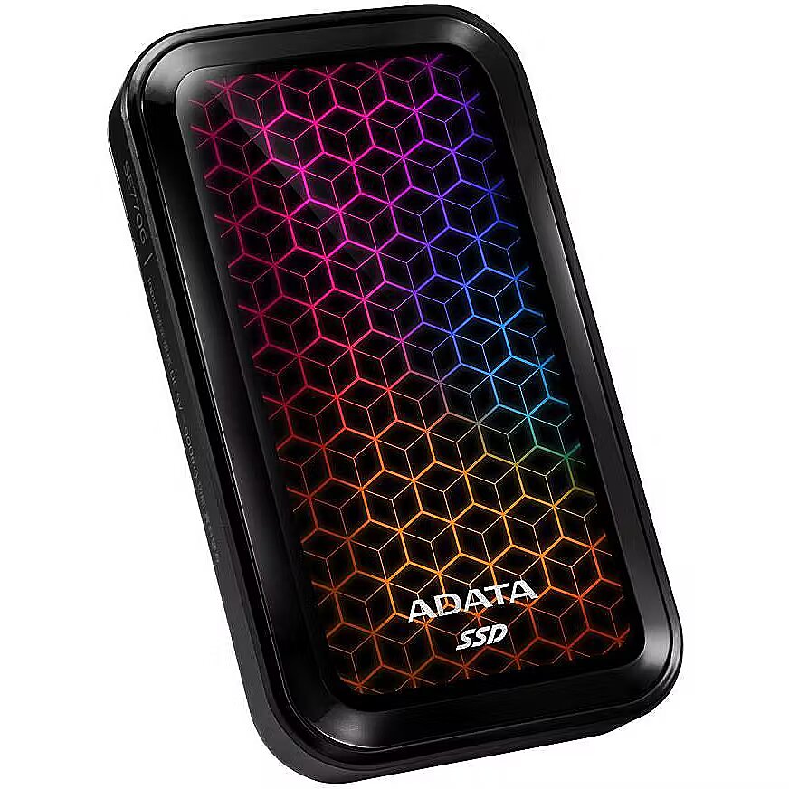 Description - ADATA SE770 External SSD Performance and power oriented. That's exactly how the SE770G external SSD can be described. With read/write speeds of up to 1000/800 MB/s and support for USB3.2 Gen 2 and Type-C interfaces, this external SSD is a storage device suitable for editing videos and photos and playing games on the go. In addition to its performance, the SE770G also impresses with its unique RGB lighting glow.   Powerful and exquisite The SE770G is not your average, standard external SSD. With its large RGB panel, it will illuminate your workspace with a magnificent cube lighting effect.   No more being in the shadows Your external SSD no longer has to hide in the shadows. Thanks to its RGB lighting, the SE770G will join your other RGB-lit devices to brighten up your desk.   Get up to speed With a USB 3.2 Gen 2 interface, the SE770G delivers read/write speeds of up to 1000/800MB/s*, up to 12.5 times faster than traditional external hard drives*. That means transferring a 10GB 4K movie in just 20 seconds.   USB-C You Cant Plug In Wrong Way The SE770G features a USB Type-C interface with a symmetrical connector that connects first time, no matter the orientation.   Using with a Game Console Connect the SE770G to your game console and use it as a spare drive for games youre not currently playing. For older game consoles, the SE770G can boost game loading speeds for a smoother experience.   Support for All Major Operating Systems The SE770G supports Android*, macOS, and Windows. With the SE770G, you can enjoy movies, photos, music and more anytime, and share them easily. Plus, it's great for gaming, too.