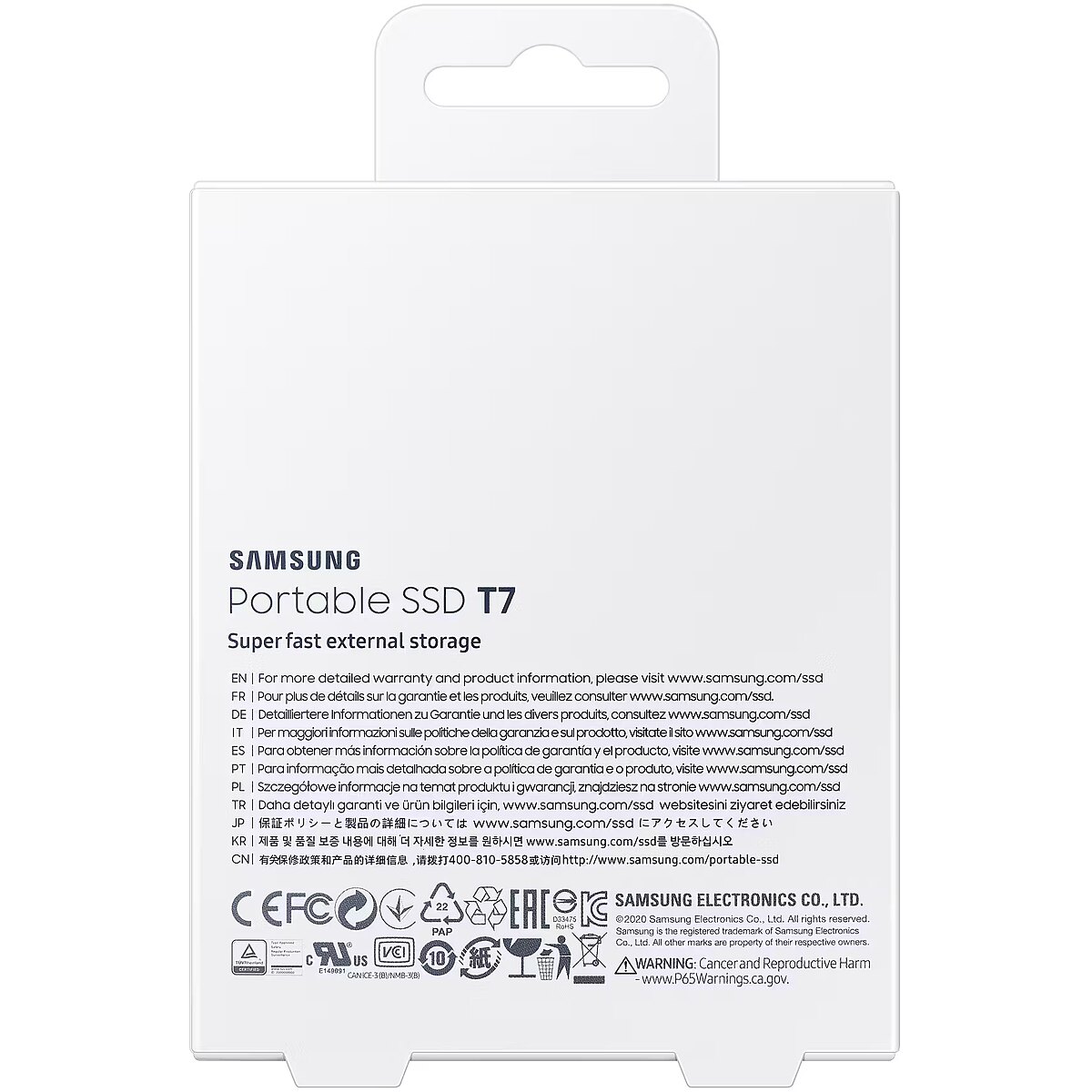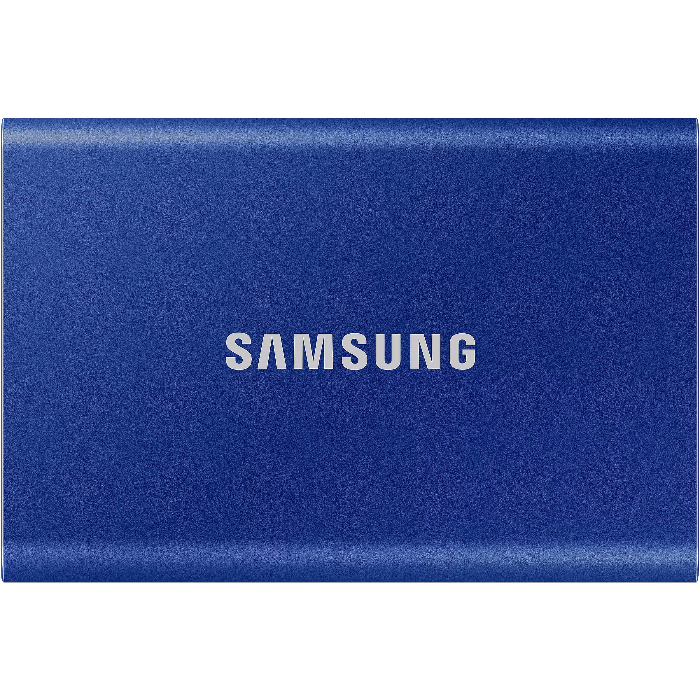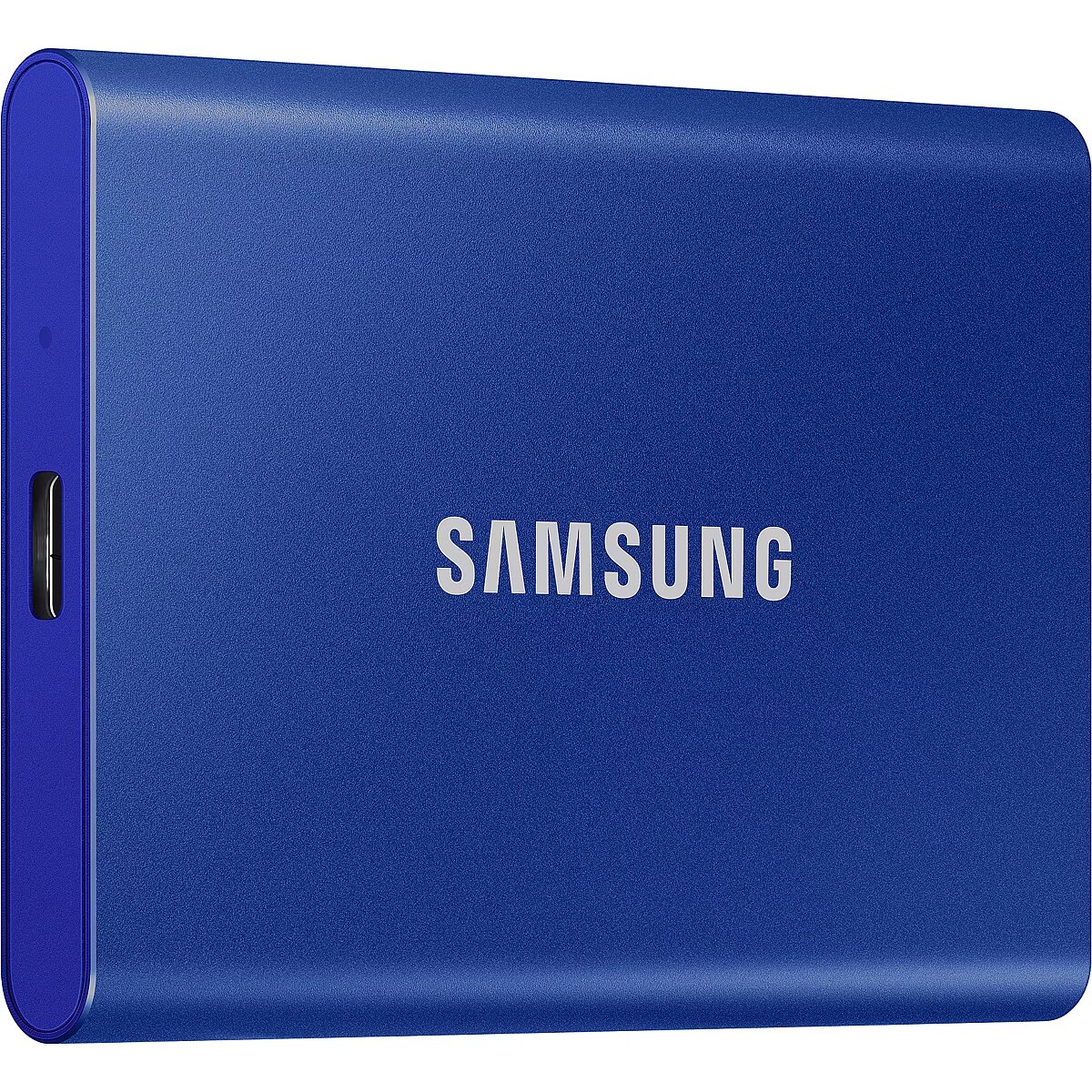 LongDesc - Transfer in a flashFeaturing sequential read/write speeds of up to 1,050 MB/s and 1,000 MB/s, the T7 can transfer massive files in mere seconds via its USB 3.2 Gen 2 interface to give your workflow a much-needed boost.Compact design with colossal capacityStore it all on a credit card-size drive with capacity from 1TB to 4TB in choice of blue or grey.Compatible with multiple devicesBundled with USB Type C-to-C and Type C-to-A cables for added convenience, the T7 minimises disruption, letting users switch seamlessly between Windows®, macOS®, smartphones, tablets or game consoles.Capture longer, save instantlyProlong your smartphone filmmaking with T7's excellent power efficiency. Capture and store 4K smartphone filming data simultaneously with T7. Enable instant editing with effortless T7 connection to your laptop or PC.Sophisticated thermal solutionUse T7 without worrying about overheating. The T7's advanced thermal solution uses the Dynamic Thermal Guard to withstand and control heat, so the compact SSD stays at an optimal temperature even at fast speeds.Built strong and secureThe T7 can be secured with an AES 256-bit encrypted password and is encased in a sturdy metal body that keeps data intact from falls of up to 2 meters. The T7 is confidently backed by a 3-year limited warranty.Samsung Magician softwareUnlock the full power of T7 with Samsung Magician software - a user-friendly suite of optimisation tools that facilitate the best portable SSD performance. Protect valuable data, monitor drive health, and get the latest firmware updates.Bringing innovations to lifeFor decades, Samsungs NAND flash memory has powered groundbreaking technologies that have changed every part of our daily lives. This NAND flash technology also powers our consumer SSDs, making room for the next big push of innovation.Lightning-fast transfer speedsWith up to 1,050 MB/s transfer speed, the T7 puts you full speed ahead at work or play.Extensive compatibilityFreely switch between devices during your workflow without disruption.Sleek and compact styleEffortlessly transfer vast data with the light and compact T7.