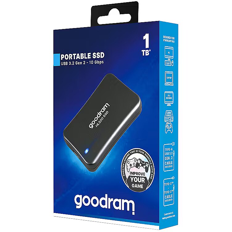 LongDesc - SSD HL200 – Small size, big potentialThe new Goodram HL200 is an external drive with a capacity of up to 1 TB. It offers almost unlimited possibilities: you can easily make backups, transfer and archive data at home or the office, as well as expand the memory of your console. The HL200 SSD has a compact form factor and is about the size of a credit card. You can easily stow it in your pocket or in a small compartment of your backpack or handbag. Transferring data has never been so easy and convenient!Proven technologyThe Goodram HL200 external drive uses NAND Flash memory, which is widely used in internal and external drives. Thanks to multi-stage testing and high quality components, the drive provides stable and fast read and write speeds even during intensive use.Highly ruggedUnlike traditional HDDs, SSDs have no moving parts, which minimises the risk of mechanical damage. In addition, the HL200’s robust casing is shock-resistant, ensuring data security even in the event of an accidental drop or use in harsh environments, including with mobile devices. In addition, SSDs consume less power compared to traditional magnetic drives, meaning that users of laptops and other mobile devices can benefit from longer run times on a single charge.SpecificationWhether you need space for holiday photos or large files, it’s easy to match the capacity of the drive to your needs, as the Goodram HL200 is available in 256 GB, 512 GB and 1 TB capacities.The HL200 delivers a smooth data transfer rate of 520/500 MB/s read/write. For convenience, two cables are included with the drive: a USB Type-A – USB Type-C™ and a double-sided USB Type-C™. This allows the drive to connect to most devices equipped with a USB port. The Goodram HL200 is an extremely versatile drive that is perfect for everyday tasks.Versatile useThe Goodram HL200 is a small drive with a lot of potential. Thanks to its specifications, it allows the convenient transfer of large files such as 4K videos and high quality photos. It can also serve as an excellent storage solution for games, working with consoles, laptops and desktops alike, thanks to its USB 3.2 gen. 2 Type-C™ interface.With its compact size and simple operation, the drive can successfully replace larger capacity memory sticks. Transferring data will be much faster and more convenient for the user.Warranty with tech supportAll Goodram branded drives undergo rigorous quality testing at every stage of production, ensuring users receive the highest quality memory.We offer free technical support to ensure trouble-free product use. All so you can enjoy Goodram branded products without worry.