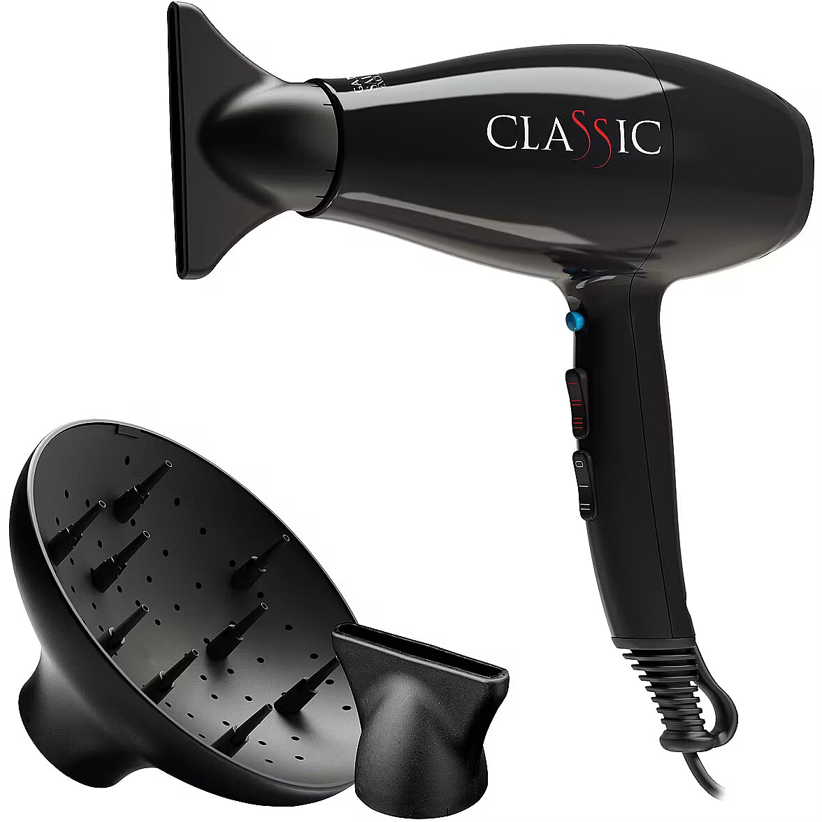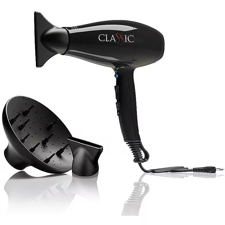 LongDesc - A light and potent professional hairdryer, with a long-lasting 2200 W AC motor and ceramic coated internal components that protect your hair from heat damage and emit frizz-fighting negative irons, for healthy, shiny hair.HAIR DRYER CLASSICClassic is a light and silent hair dryer, available in 3 colors: white, black and green. Its particular shape and design make it an extremely silent hair dryer without compromising its performance. It is indeed a powerful hair dryer with 2200 W and is equipped with an AC motor, which makes it the latest generation device, reliable and able to last more than 2000 hours of work. It is equipped with a diffuser, perfect for creating waves and curls in a completely natural way, and two professional 4- and 8-mm nozzles, the first for a particularly precise airflow, the second for ultra-fast drying with a more diffused heat. Classic features 2 speeds and 3 temperatures that you can combine to find the right degree of heat for you and the cool shot button, which is the cold air shot needed to fix the styling for a long time. The shape and size of this hair dryer allow great handling and do not strain your arms when using it.