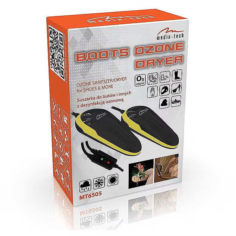 Description - What is ozone? Ozone (stgr. [ódzn] - fragrant), tritylene (O3) - allotropic form of oxygen consisting of three-atomic molecules. It has strong aseptic and toxic properties. It is used, for example, in water disinfection and plays an important role in absorbing parts  ultraviolet from the sun to the earth (see ozone hole). Advanced disinfection and drying technology available to everyone shoes, helmets and gloves. Here are some facts that you may not be aware of: 140 fungal spores and bacteria live in the shoes alone. A similar amount of microorganisms is found in gloves, caps, helmets, etc. Fungi and bacteria cause not only unpleasant odors but also dangerous diseases e.g. athlete's foot, dandruff and other dermatological changes Fungus spores and bacteria are everywhere: in the shower cubicle, at the swimming pool, on the beach, at the gym, in the bowling alley and even on the home floor, clinic or airport or clothing and shoe store Moisture in shoes or gloves promotes the development and multiplication of "uninvited guests" Mycosis is not the result of poor hygiene but a combination of unfavorable circumstances Ringworm is easy to get but hard to get rid of Treatment of ringworm is expensive   The usual ways of drying shoes and other clothes and preventing the growth of fungi and bacteria: Clothes dryer, sun exposure or even a hair dryer> ineffective, destroys clothing Footwear sterilization service in an external company or clinic> effective, but expensive and one-off Shoe deodorant> masks the unpleasant odor for a while, leaving the problem of fungi and bacteria unsolved Chemical agents for disinfecting shoes (spray and powder) - the need to use them after each removal of shoes,  can cause allergic reactions and damage shoes BOOTS OZONE DRYER A cheap, effective and safe solution to footwear problems: Gently removes moisture from the inside of the footwear thanks to the automatically selected drying temperature Thanks to the ozone generator, 99,7% of fungi and approx. 650 types of bacteria are killed Ozone reaches even hard-to-reach places inaccessible to sprays and powders Ozonation is a professional sterilization method used in medicine and cosmetology Disinfects, refreshes and helps to get rid of unpleasant odors from footwear Extremely simple and safe for the user and footwear Due to its shape, the device can also be used to disinfect other components of clothing: e.g. gloves and hats. Very low cost of use - power consumption 10W
