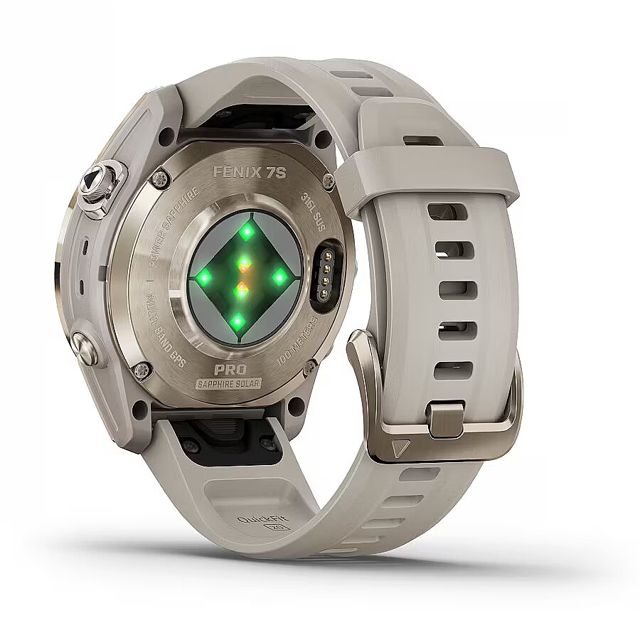 Meet any athletic or outdoor challenge with the rugged fēnix 7S Pro Sapphire Solar multisport GPS watch. It’s styled for smaller-sized wrists, and its Power Sapphire™ solar charging lens extends battery life — powering advanced training features, sports apps, health and wellness monitoring sensors and more. • Get a battery boost from the sunlight, so you can go longer between charges.