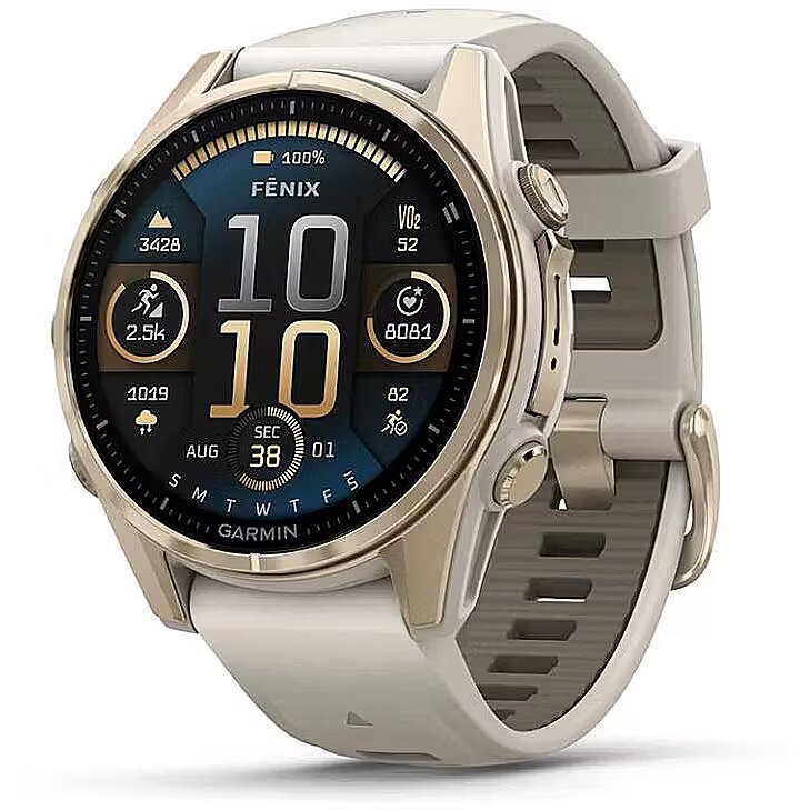 Description - fēnix® 8 – 43 mm, AMOLED Sapphire, Soft Gold with Fog grey/dark sandstone silicone band BE LIMITLESS For serious athletes and adventurers who want to push beyond their limits, this premium multisport GPS smartwatch is built to perform — with advanced strength training features, dive capability, an internal speaker and mic for voice features, a built-in LED flashlight and compact styling for smaller wrists. BRIGHT, CRISP AMOLED DISPLAY UP TO 10 DAYS OF BATTERY LIFE IN SMARTWATCH MODE SPEAKER AND MICROPHONE FOR VOICE MESSAGING1 AND CONTROL BRIGHT BUILT-IN LED FLASHLIGHT SPORT-SPECIFIC STRENGTH WORKOUTS 24/7 HEALTH AND WELLNESS FEATURES