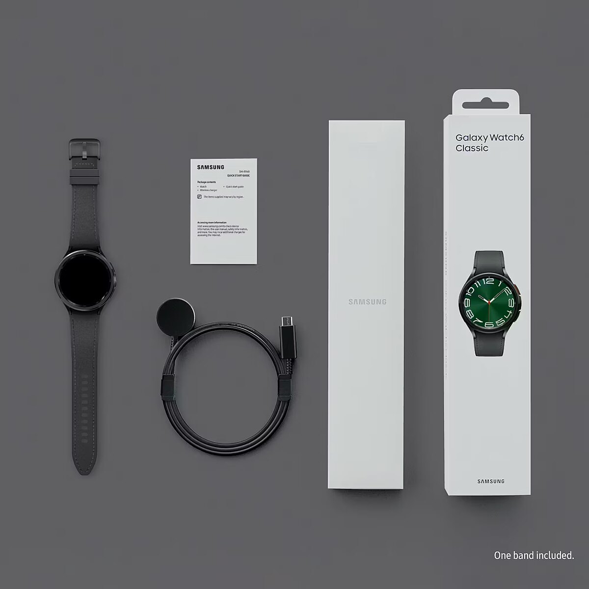 LongDesc - More screen. Thinner bezelExperience enhanced visuals and clear motion graphics on a 30% larger display. The 15% thinner bezel and increased screen size create an aesthetically perfect display-to-bezel ratio — and extra space for every tap and swipe.Sapphire Crystal glass. A clear difference in durabilityDesigned to withstand daily wear and tear. The display of Galaxy Watch6 Classic is expertly crafted with Sapphire Crystal glass to protect its timeless beauty. And the finishing has IP68 and 5ATM ratings, so you can keep your watch on through all your adventures.Go from boardroom to weight room in a snapSwapping bands is as seamless as pressing the quick release button. A convenient guide lets you install the new band with ease — just press gently until you hear a click. Transition from work to workout or back again without breaking a sweat.More processing power to do more with every minuteGet more done in less time with Galaxy Watch6 Classic's upgraded processor. The 18% faster CPU speed and quick app launch time keep you productive and efficient throughout the day.Charge up in record timeWith one full charge, the watch lasts up to 40 hours. Fast charge the watch to 45% in just 30 minutes and you're all set to explore the great outdoors or enjoy a well-deserved break in bed.Hands-on shooting, hands-freePair your watch with Galaxy Z Fold5 to capture the healthy you up close or from a distance. Galaxy Z Fold5's Flex mode and Camera Controller let you easily switch between photo and video mode, or zoom in and out, all from the comfort of your wrist. Then tap the shutter button on your watch to take a pic.Samsung Wallet is always on handAccess Samsung Wallet right from your Galaxy Watch6 Classic. Make payments, ride public transit, scan membership cards and more. You can even store non-payment items like digital IDs, tickets and keys, to lighten your load and empty out your pockets.Wake up to our most advanced sleep trackingGet detailed sleep tracking with improved analysis and deeper insights to enhance the quality of your sleep. And now you can access Sleep Coaching on your Galaxy Watch6 Classic to build better sleeping habits. Get a good night's sleep when wearing your watch to bed by switching to the Fabric Band. Be sure to put your watch on sleep mode to change the PPG sensor's green LED to invisible infrared LED, dim the display brightness and mute notifications.Be prepared with Cycle TrackingGet in tune with your health and body. Cycle Tracking powered by Natural Cycles˚ uses your nightly skin temperature from your watch, measured while you sleep, to predict the dates of your period and other cycles. Plan ahead and live life to the fullest with Galaxy Watch6.A heart monitoring package that watches over youLessen your worries with a heart monitoring package that brings you peace of mind, so you can focus on your day. The built-in PPG sensor periodically measures heart rate and heart rhythm while you wear your Galaxy Watch6, and will alert you if your heart rate is too high or too low. It will also send you a notification if it detects an irregular heart rhythm, along with a prompt to take an ECG to examine your heart rhythm in more detail.Keep a watchful eye on your blood pressureStay informed and stay healthy. Let the watch take charge in measuring and tracking your daily blood pressure so you can focus on making sound choices for a balanced lifestyle.Clock your goals with BIAKeep an eye on your body composition with detailed Bioelectrical Impedance Analysis (BIA). Set your target weight, body fat, muscle mass and more, then set up an optimized program to help you achieve your health and wellness goals.Meet your Personlized HR ZoneYour watch can assess your fitness capacity to determine your personal HR Zone. If there's a specific HR zone you want to hit, you can set the goal manually. As you workout you'll be alerted when you enter your target HR Zone, whether that's fat burning, cardio or high-intensity training. Move out of the zone, and it'll alert you too — letting you adjust your effort accordingly.Exercise tracking - Chart your growth to peak performanceGain valuable insights into your progress and achievements with Galaxy Watch6 Classic. Track over 90 different workouts, or you can even create your own custom workout, to log your daily activity and monitor your progress. You can activate auto detect for select workouts like running, walking, and now, cycling to go straight from warm up mode to beast mode.Change plans? Change bands. Change facesCreate your own bespoke look for Galaxy Watch6 Classic. Choose from a wide collection of bands to take your look from rugged to classy, depending on your mood. Customize your watch face with a sleek design or complications to quickly access your favorite apps.