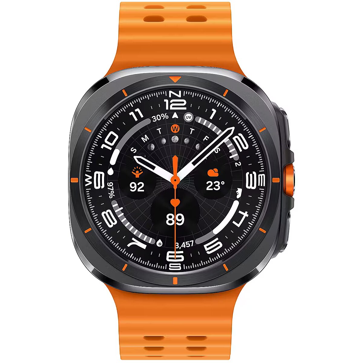 LongSummaryDescription - Samsung Galaxy Watch Ultra . Display diagonal: 3.81 cm (1.5"), Display technology: AMOLED, Display resolution: 480 x 480 pixels, Touchscreen. Processor frequency: 1600 MHz, RAM capacity: 2000 MB, Flash memory: 64 GB. Wi-Fi. GPS (satellite). Battery capacity: 590 mAh. Weight: 60.5 g. Band colour: Orange, Band size: One Size. Operating system installed: Wear OS