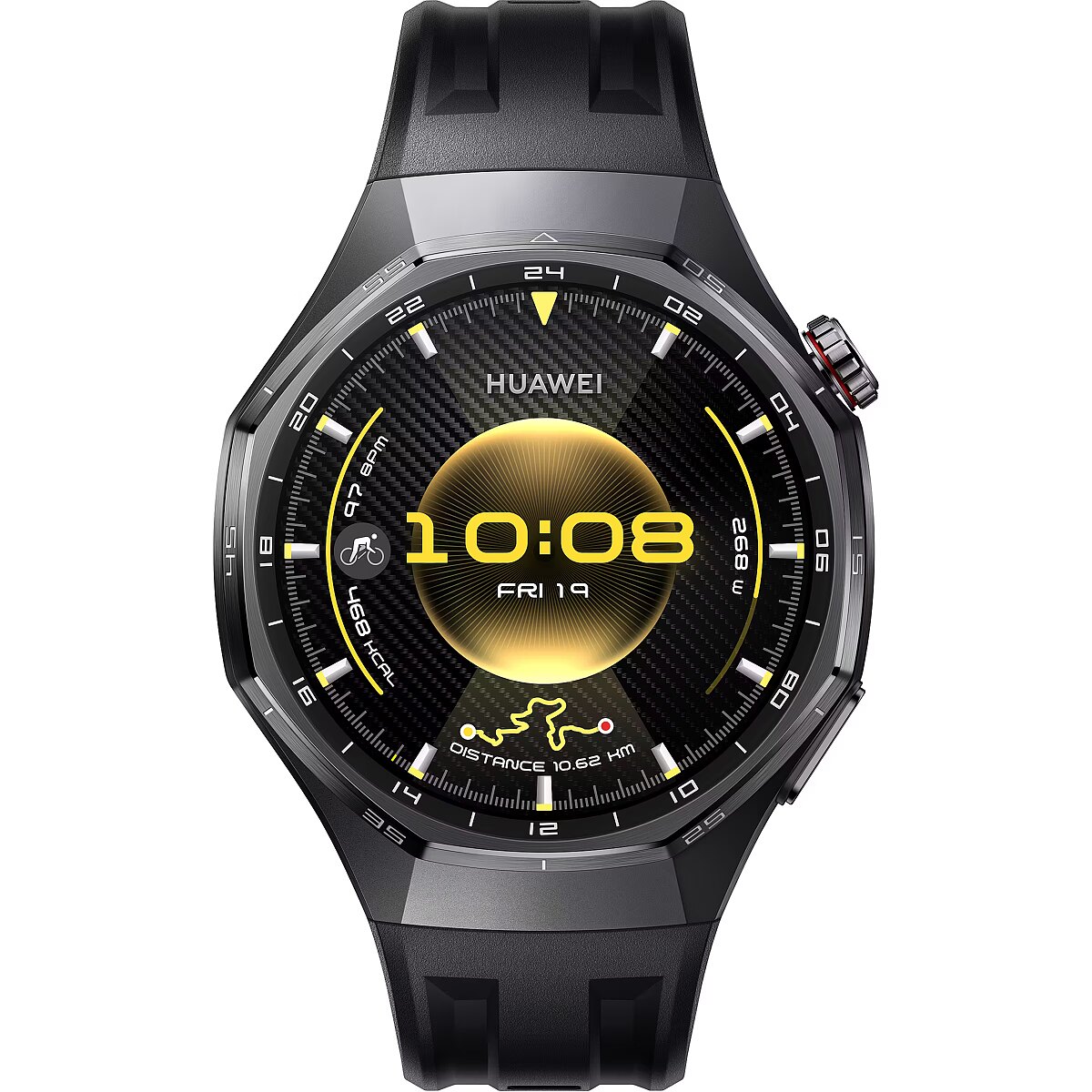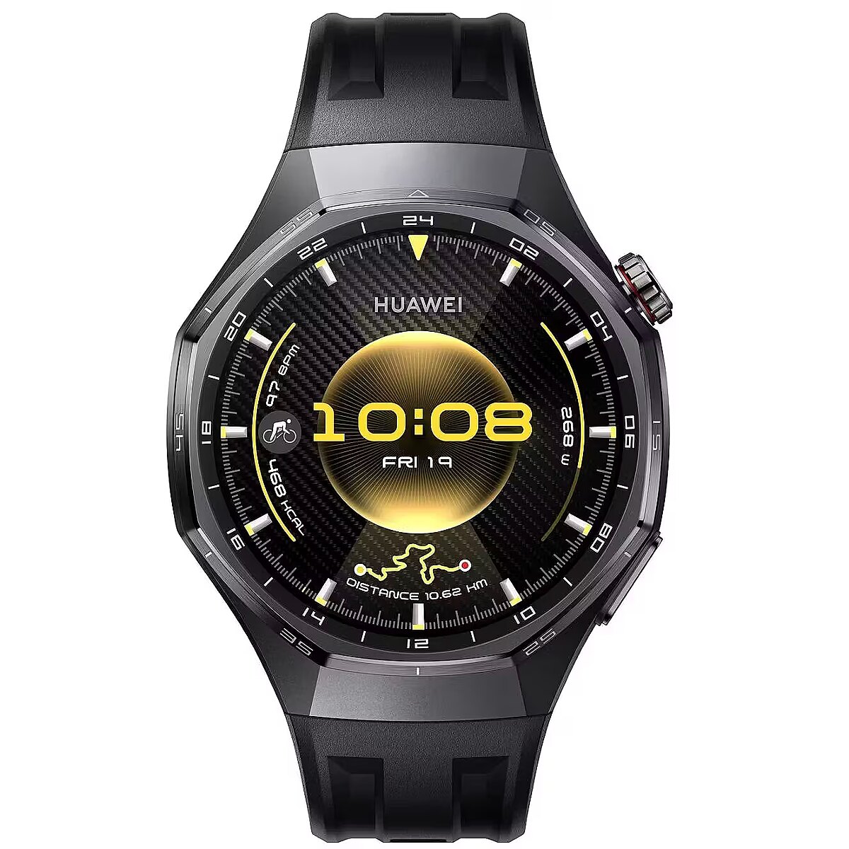 Signature strong endurance with up to 21 days battery life.1 With the innovative adoption of a high-silicon battery, the energy density surges by 37%.5 Go all out on your adventure on one charge. Up to 21 days in light use Up to 12 days in typical use Up to 7 days with AOD enabled Road Ride in the right direction. The upgraded HUAWEI Sunflower Positioning System achieves 20% increase in positioning accuracy through enhanced GNSS algorithms and antenna architecture. Power your ride forward. Let go of the power metre from now on. Tap the Cycling Virtual Power that monitors the real-time and average power to adjust your workout intensity. Train with science. If paired with the power metre, it will measure your key FTP metrics over time, tracking your performance progress. A wealth of data at hand. Connect with the heart rate strap, cadence sensor, power metre and speedometer via Bluetooth to access pro-level statistics on your wrist. Ride with heart. Sync your heart rate data to the bike computer for seamless analysis at a glance. Expedition The road is long but safe. The watch always keeps you company in the case of emergency. Just relax and ride along. You're in safe hands. Fall Detection will identify falls via a long-range IMU sensor, and send an SOS call or request to the chosen contacts automatically after your confirmation. Call for help. Make 5 quick presses on the crown to send an SOS call and a message with your location. Cycle for up to 40 hours. It's always here as you aim for somewhere far. Every milestone leaves a mark. Unlock a badge to celebrate your new records in speed or mileage. What a rewarding journey. Recreation Know your way around. Whether for daily commute or casual exploration of your town, it helps you navigate with ease. Turn your phone into a bike computer. Sync data to your phone. Rides with the animated cycling graphic on the screen which moves you all along. Reads the directions for you. Put on the earphones, keep your eyes on the roads, and let the voice navigation guide you in the right direction. Enjoy a free and safe ride. Records what really counts. The watch identifies your cycling status to start tracking automatically, excluding breaks such as red light waits. Broadcast your feats. Generate your unique poster to share your cycling achievements with your friends. Run Wild