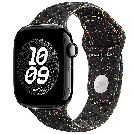 description_en - Made with compression-moulded perforations for breathability, the Nike Sport Band is durable and strong, yet surprisingly soft. It features colourful flakes that create a randomised pattern, making each strap unique. The smooth, dense material drapes elegantly across your wrist and feels comfortable next to your skin. An aluminium pin-and-tuck closure — carefully etched with the Run Swoosh logo — gives the pin a fresh matt finish.