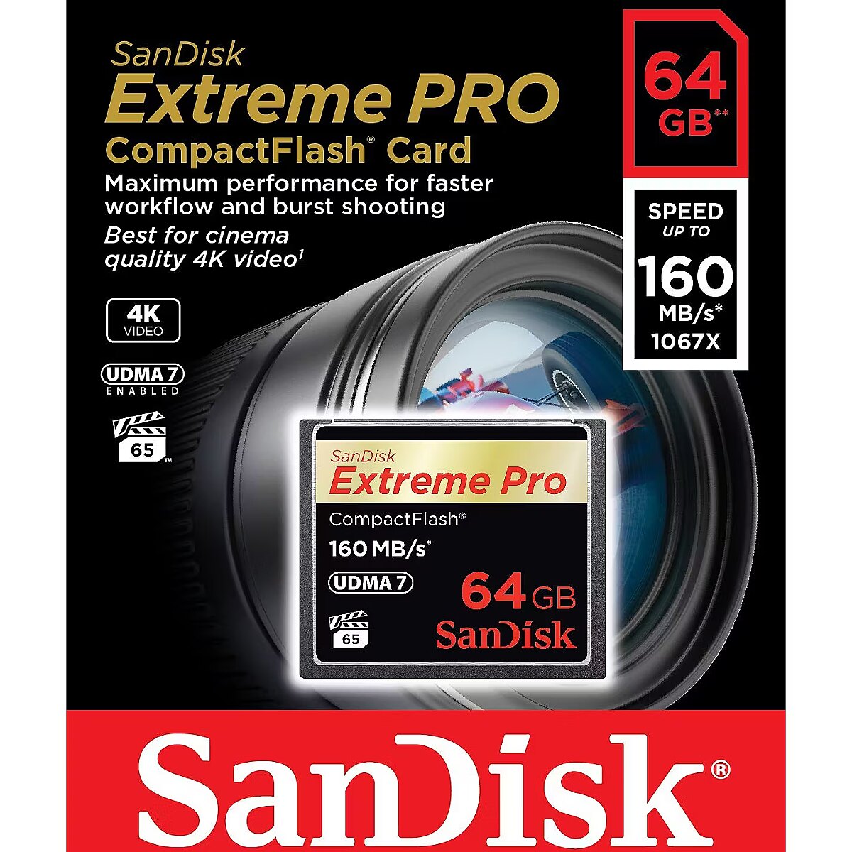 Description - INDUSTRY-LEADING COMBINATION OF STORAGE CAPACITY AND PROFESSIONAL-GRADE PERFORMANCE Get high-capacity storage, faster shot-to-shot performance, and cinema-quality video with the SanDisk Extreme PRO CompactFlash Memory Card. With transfer speeds of up to 160MB/s, this card offers the fast, efficient performance you expect from the global leader in flash memory cards. This industry-leading memory card is optimized for professional-grade video capture, with a minimum sustained write speed of 65MB/s for rich 4K and Full HD video. Capacities up to 256GB accommodate hours of video and thousands of high-resolution images. So you never miss a scene or shot, this memory card resists extreme temperatures, shock, and other conditions.