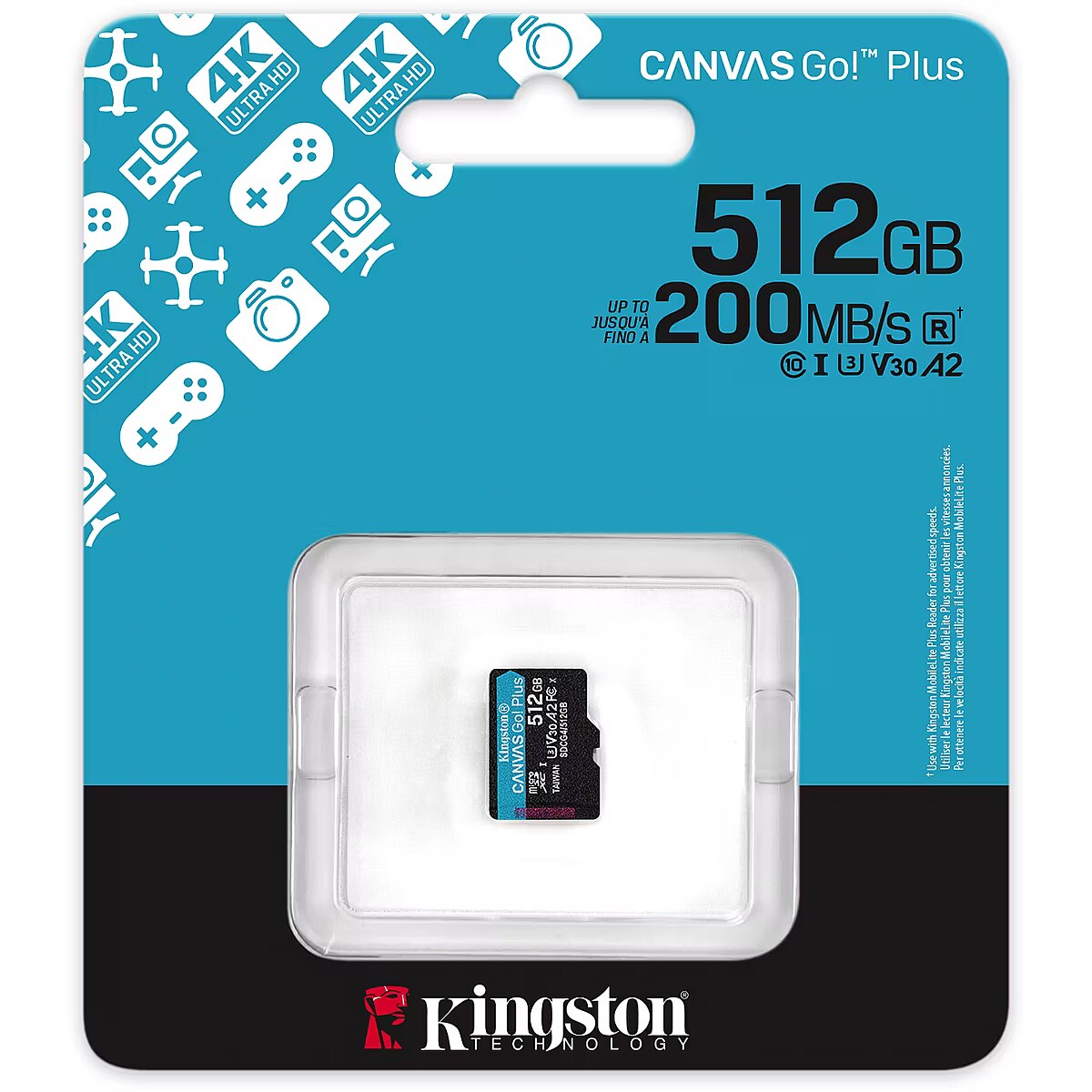 description_en - The Kingston Canvas Go! Plus microSDXC 512GB memory card is designed for adventurers and mobile gaming enthusiasts who demand high performance and reliability. It delivers blazing read speeds up to 200 MB/s and write speeds up to 160 MB/s, ensuring smooth 4K Ultra HD video recording and fast app loading.Certified for UHS-I U3, V30, and A2 speed classes, it is ideal for use in action cameras, drones, and Android devices.Built to withstand tough environments, the card is waterproof, temperature-proof, and X-ray-proof, making it a perfect companion for any challenge.