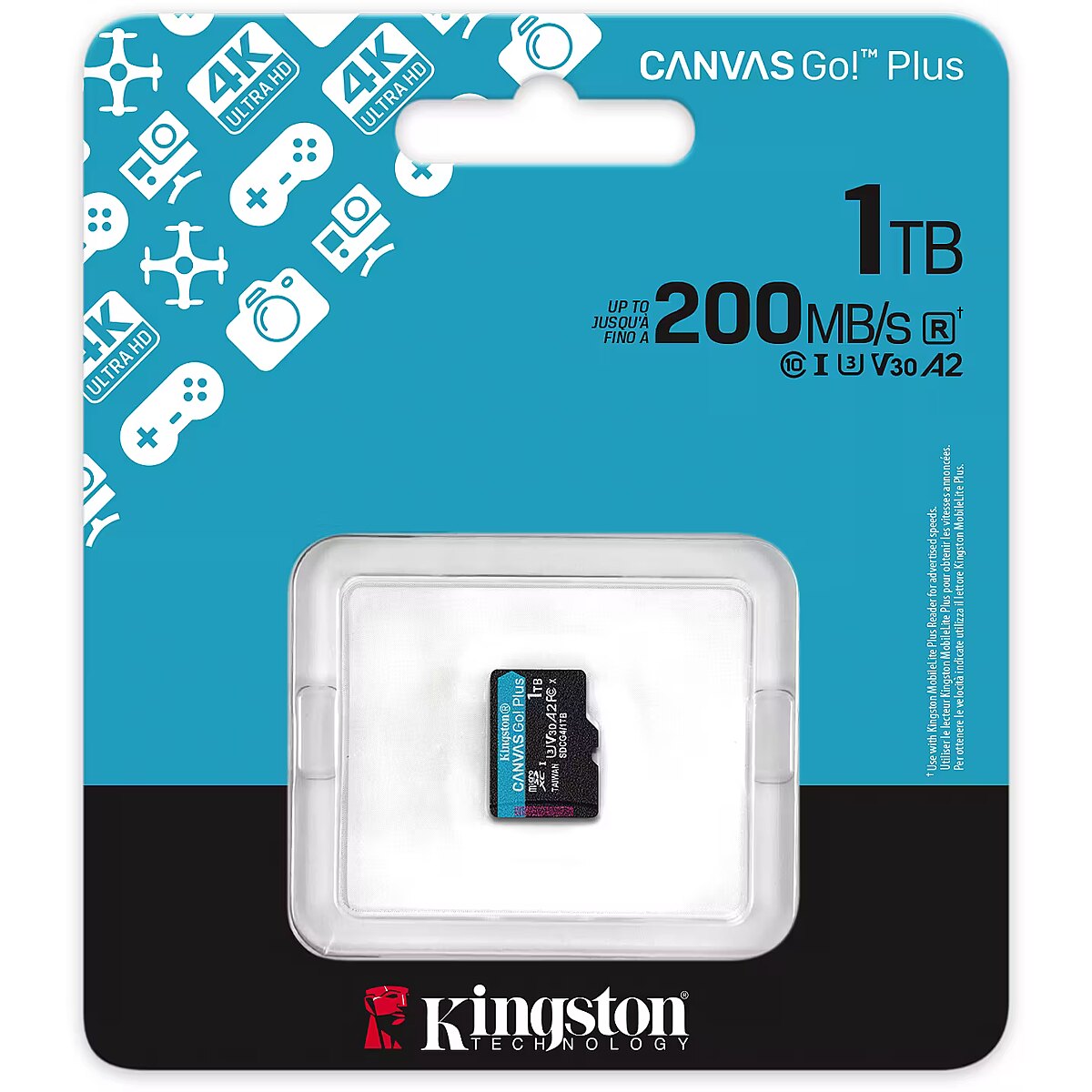 LongDesc - For mobile gaming, drones, action cams and Android™ devicesKingston’s Canvas Go! Plus microSD is built for adventure seekers and mobile gamers, delivering read speeds of up to 200MB/s* for seamless 4K UHD recording and fast app performance. With U3 and V30 ratings, it ensures smooth action camera and drone footage, while A2 class boosts mobile gaming.Kingston’s Canvas Go! Plus microSD is designed for adventure seekers and mobile gamers who demand high performance on the go. With lightning-fast transfer speeds of up to 200MB/s*, it streamlines your workflow, allowing you to spend more time capturing and creating.Optimised for action cameras and drones, the U3 and V30 speed ratings enable smooth, uninterrupted recording of stunning 4K Ultra-HD videos, even in fast-paced scenarios. Whether you're documenting extreme sports or capturing breathtaking aerial footage, the Canvas Go! Plus delivers reliable, lag-free performance.For mobile gaming enthusiasts, the A2 Application Performance Class ensures faster app load times and seamless gameplay on smartphones and tablets. Say goodbye to frustrating delays and hello to an enhanced gaming experience wherever you are. With an optional SD adapter, the Canvas Go! Plus provides added versatility, making it compatible with a wide range of SD-enabled devices."Superior speedsCapture content and transfer faster in Full HD & 4K UHD with speeds up to 200MB/s.* Ideal for drones and action camerasHigh speeds with UHS Speed Class 3 (U3) & Video Speed Class 30 (V30) ratings.Supports A2 app performance classExperience faster app load times and seamless gameplay.DurableFor peace of mind, cards are extensively tested and proven to be waterproof, temperature proof and X-ray proof.**