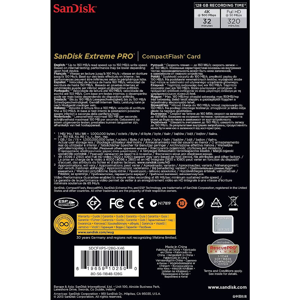 Description - INDUSTRY-LEADING COMBINATION OF STORAGE CAPACITY AND PROFESSIONAL-GRADE PERFORMANCE Get high-capacity storage, faster shot-to-shot performance, and cinema-quality video with the SanDisk Extreme PRO CompactFlash Memory Card. With transfer speeds of up to 160MB/s, this card offers the fast, efficient performance you expect from the global leader in flash memory cards. This industry-leading memory card is optimized for professional-grade video capture, with a minimum sustained write speed of 65MB/s for rich 4K and Full HD video. Capacities up to 256GB accommodate hours of video and thousands of high-resolution images. So you never miss a scene or shot, this memory card resists extreme temperatures, shock, and other conditions.