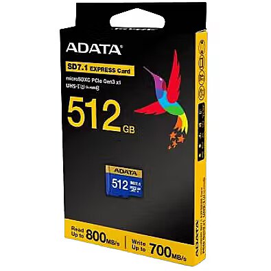 LongSummaryDescription - ADATA UD512GEX3L1-C. Capacity: 512 GB, Flash card type: MicroSDXC, Internal memory type: UHS-II, Read speed: 800 MB/s, Write speed: 700 MB/s, UHS Speed Class: Class 3 (U3), Video Speed Class: V30. Product colour: Blue, Yellow