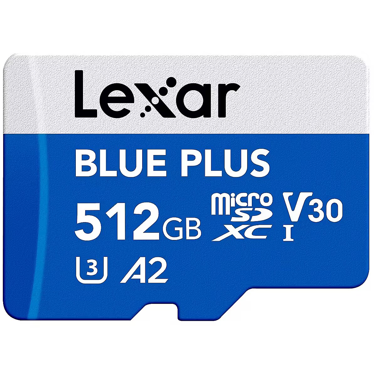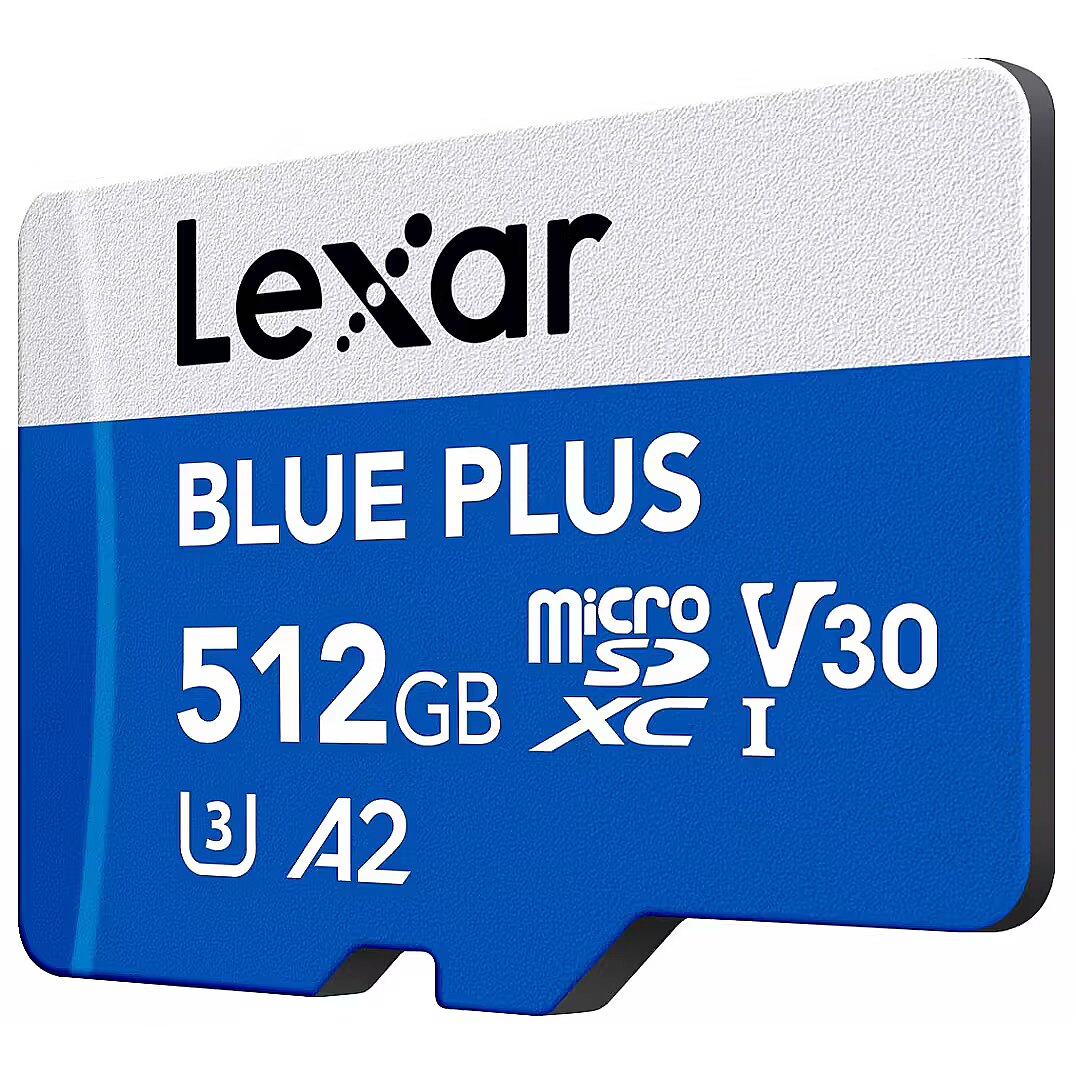 Summary - Lexar BLUE PLUS. Capacity: 512 GB, Flash card type: MicroSDXC, Internal memory type: UHS-I, Read speed: 170 MB/s, UHS Speed Class: Class 3 (U3), Video Speed Class: V30. Protection features: Drop proof, Magnet proof, Shock resistant, Temperature proof, Vibration proof, Waterproof, X-ray..., Product colour: Blue