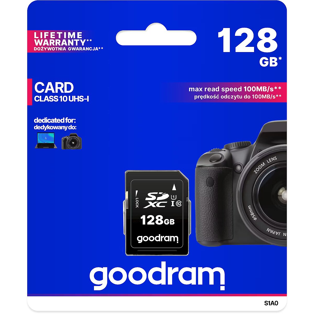 LongSummaryDescription - Goodram S1A0. Capacity: 128 GB, Flash card type: SDXC, Flash memory class: Class 10, Internal memory type: UHS-I, Read speed: 100 MB/s, Write speed: 10 MB/s, UHS Speed Class: Class 1 (U1). Product colour: Black