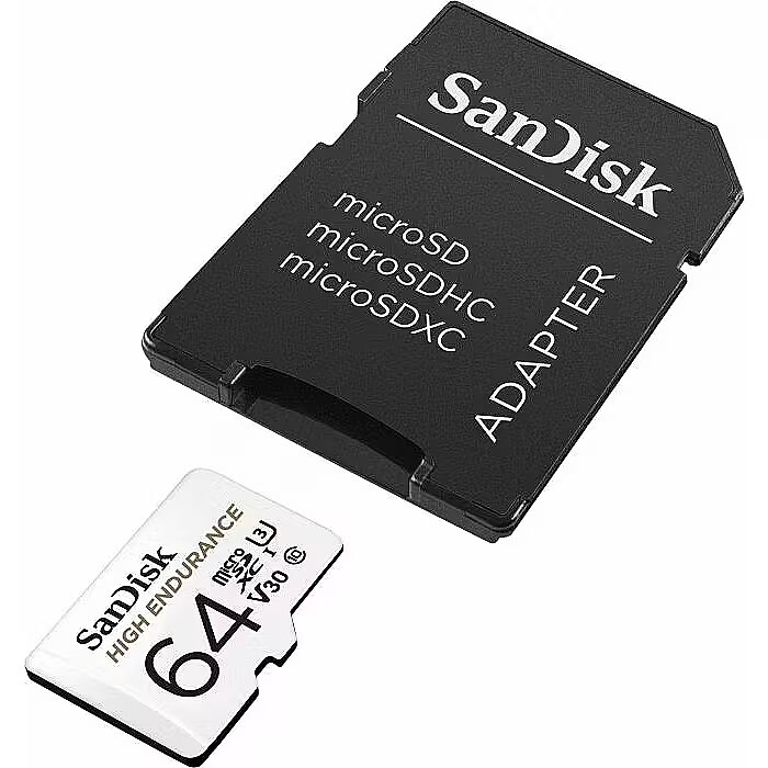 ProductDescription - SanDisk High Endurance microSDXC 64GB + SD Adapter - for dash cams & home monitoring, up to 5,000 Hours, Full HD / 4K videos, up to 100/40 MB/s Read/Write speeds, C10, U3, V30
