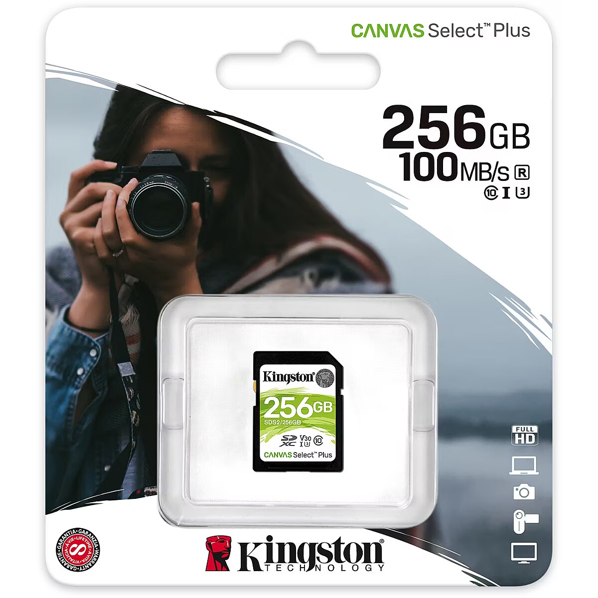 LongDesc - Kingston’s Canvas Select Plus SD card is designed with exceptional performance, speed and durability for heavy workloads such as transferring and developing high-resolution photos or capturing and editing Full HD videos. It can reach Class 10 UHS-I speeds of up to 100MB/s* for easy storage and quick transfers, along with a Video Class 30 interface that can record cinematic Full HD videos**. The Canvas Select Plus SD card is built to perform in the harshest environments and conditions so you can take it anywhere knowing that your files, photos and videos are protected. Available in multiple capacities of up to 512GB*** and with a lifetime warranty. Faster speedsCapture images and videos in Full HD (1080p)