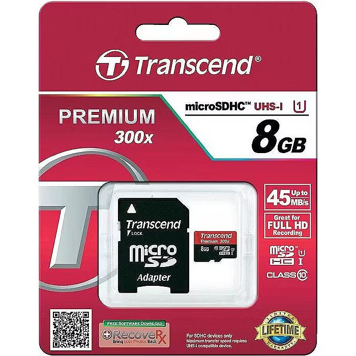 Description - microSDHC Class 10 UHS-I 300x (Premium) Combining next-generation Ultra High Speed Class 1 technology with extra large capacity, Transcend microSDXC UHS-I memory cards not only provide the best possible performance during a host of mobile activities but also enough storage space to carry an entire collection of personal media files. - Supports Ultra High Speed Class 1 specification (U1) - Smooth Full HD video recording performance - Ideal upgrade for smartphones, tablets, and digital cameras - Class 10 compliant - Built-in Error Correcting Code (ECC) to detect and correct transfer errors - Exclusive RecoveRx photo recovery software