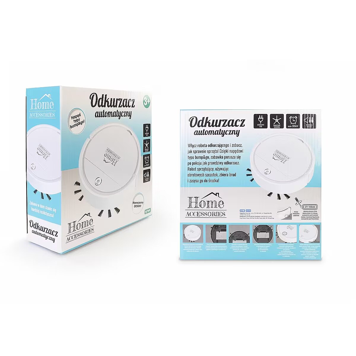 Description - CLEANING ROBOT Features: Air suction Removable compartment with filter Sound of a real hoover Bump n go drive Illuminated on/off button Brushes rotate during operation
