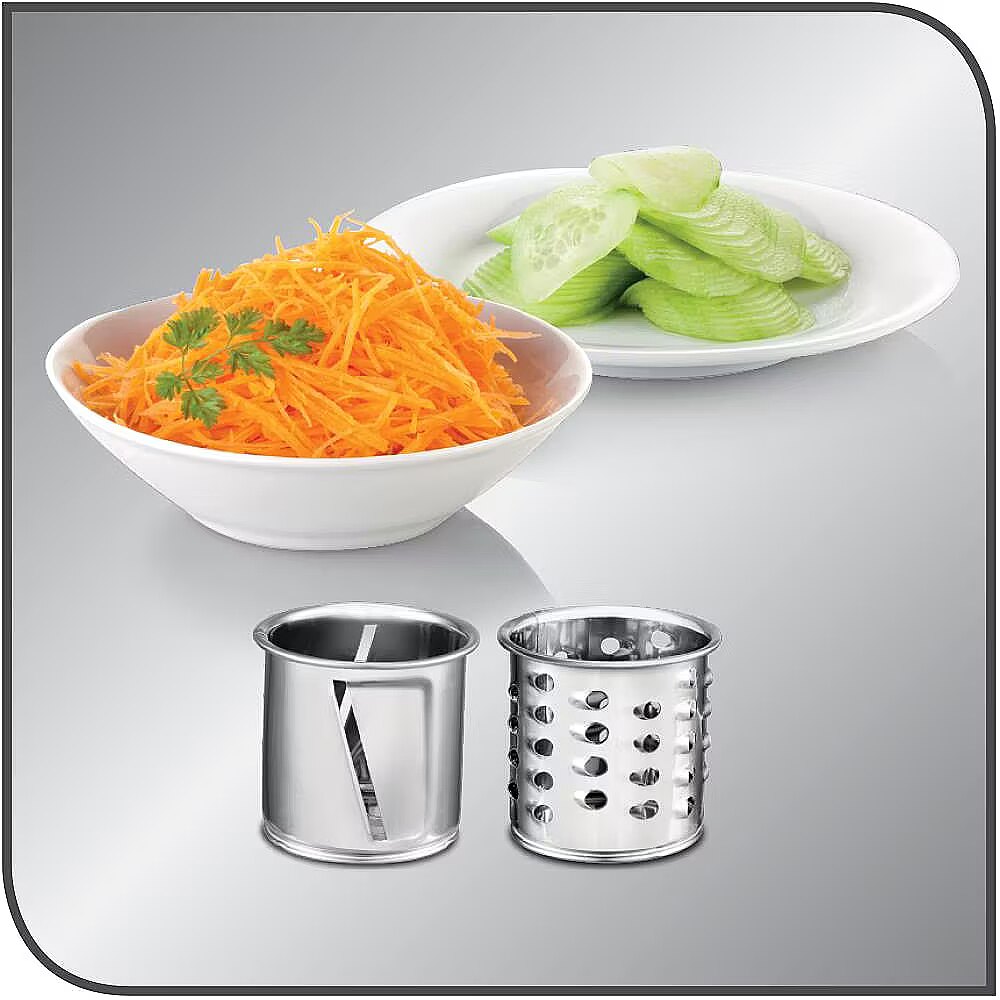 • Enjoy variety of dishes and even juices thanks to a juice accessory and multifunctional drums for quick shredding and grating
