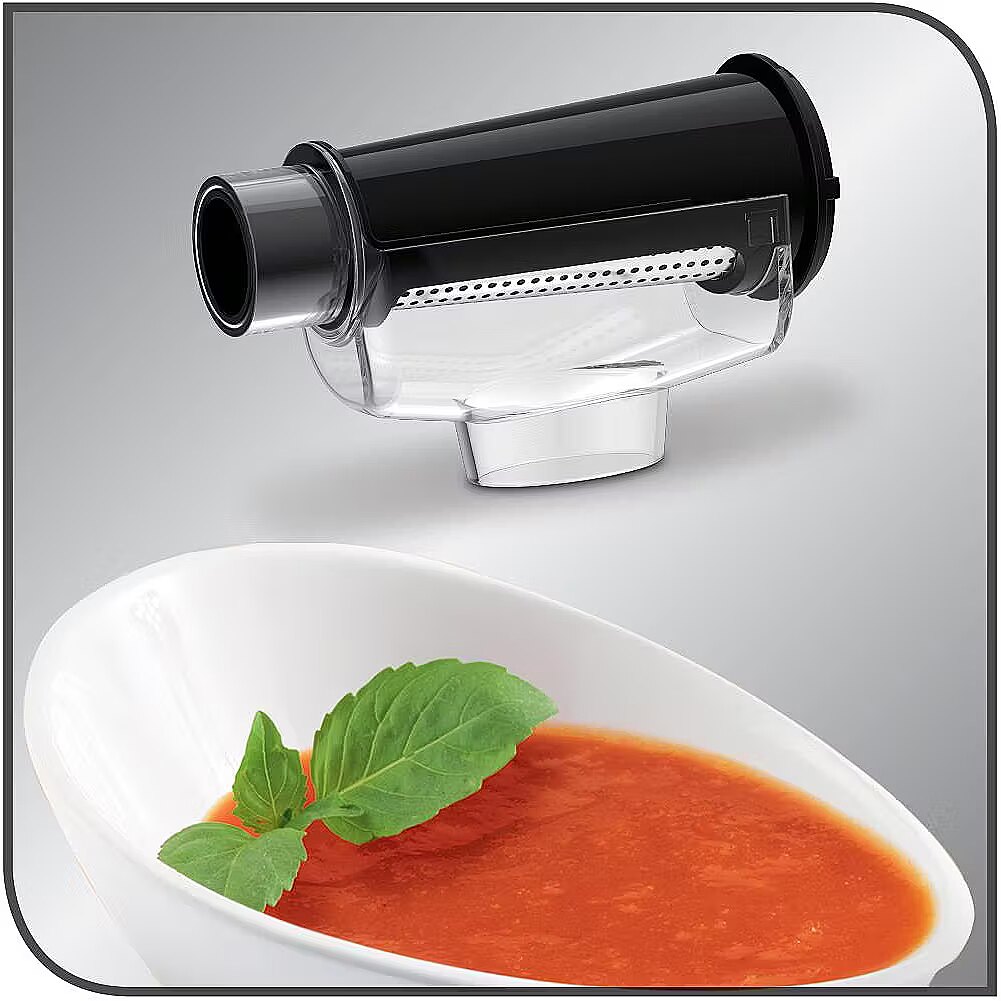 • 3 režģi un 2 smalcinātāji rīvēšanai un griešanai, piederums tomātu mērcēm un sulām;