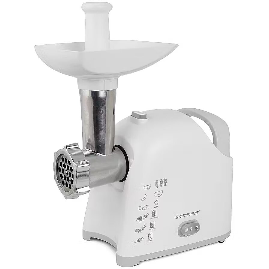 Description - The Esperanza WELLINGTON meat grinder with slicer is a modern and functional device that will be very useful in every home kitchen. The device in the "grinder" function will very easily grind not only meat, but also other food products, and additional attachments will allow you to make sausages or "kebbe". During the "shredder" function, Esperanza WELLINGTON is perfect for chopping fruit, vegetables, hard cheese, chocolate, nuts or preparing crumbles. Anti-slip rubber feet guarantee stable and safe operation of the device. maximum power: 2200 W stainless steel knife with long service life metal worm drive 3 grinding disc strainers with different hole diameters: 3.0mm 5.0mm 7.0mm forward and reverse movement function nozzle for making sausages nozzle for kneading kebbe balls 3 different shredding drums non-slip rubber inserts ensuring stable operation of the device net weight: 2.45 kg product dimensions: 27.5 x 13.5 x 35.0 [cm] power cord length: approx. 85 cm power supply: 230V, 50Hz