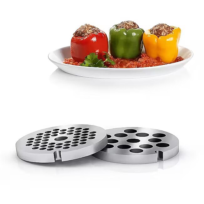 Accessories included - Lejek Popychacz Przystawka do robienia kielbasy Zestaw sitek do maszynki do miesa 4 mm Zestaw sitek do maszynki do miesa 8 mm