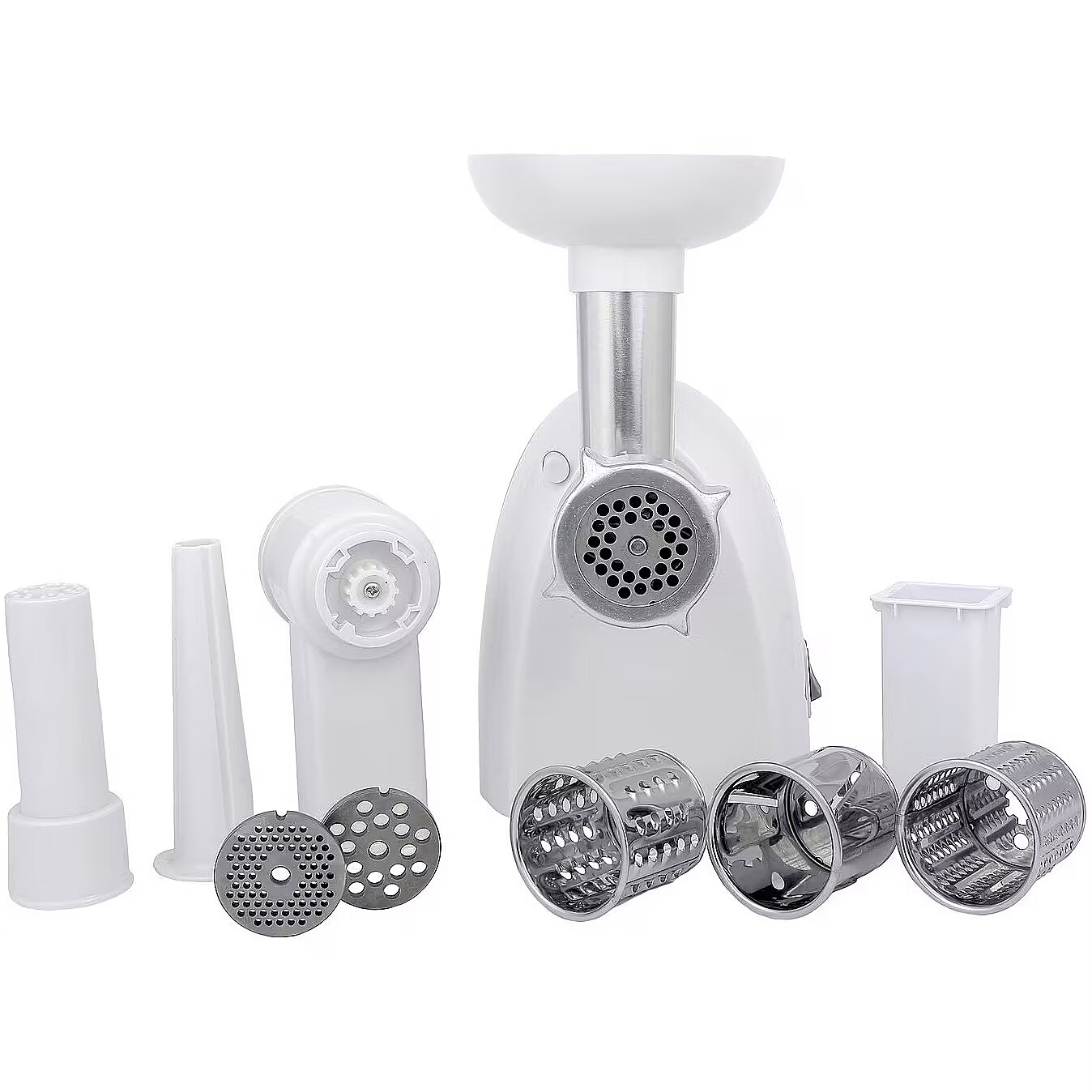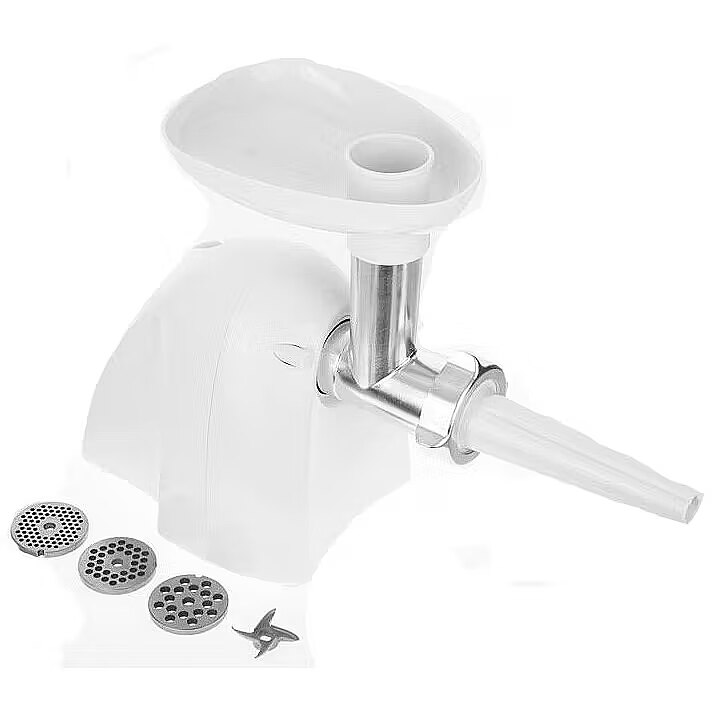Packaging content > Accessories included - Middle size sieve, mince sieve, poppy sieve, plunger, sausage filler, vegatable attachment.